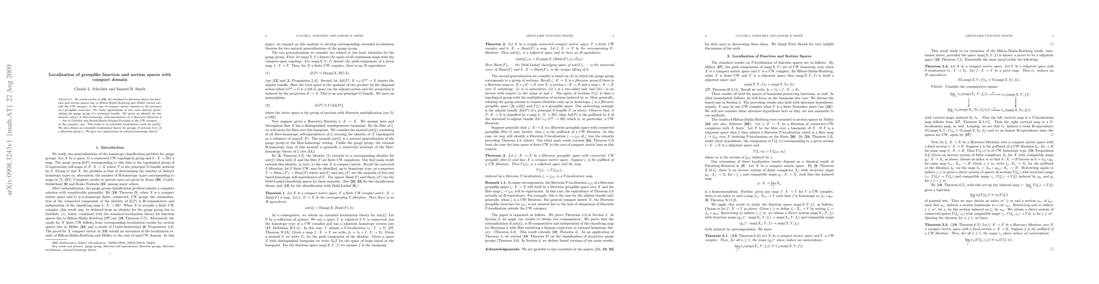 We extend the standard localization theory for function and section spaces due to Hilton-Mislin-Roitberg and Moller outside the CW category to the case of compact metric domain in the presence of a grouplike structure. We study applications in two cases directly generalizing the gauge group of a principal bundle. We prove an identity for the monoid of fibre-homotopy self-equivalences of a Hurewicz fibration -- due to Gottlieb and Booth-Heath-Morgan-Piccinini in the CW category -- in the compact case. This leads to an extended localization result for this monoid. We also obtain an extended localization theory for groups of sections of a fibrewise group. We give two applications in rational homotopy theory.