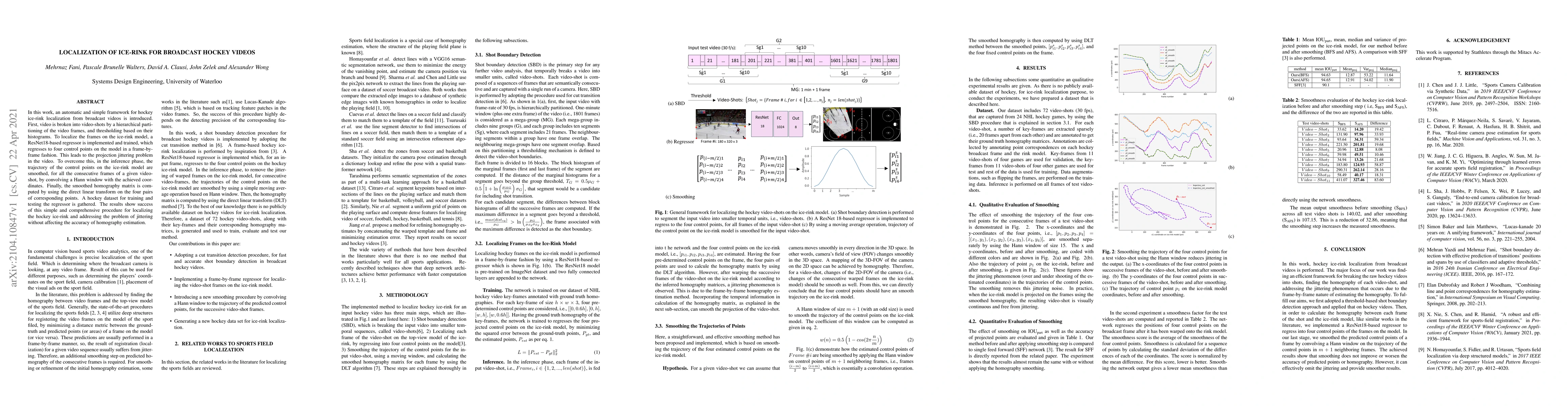 Researchers developed a simple framework to automatically localize hockey ice-rinks from broadcast videos, addressing issues like jittering without compromising accuracy. The approach involves hierarchical partitioning, smoothing control points, and homography estimation using machine learning and image processing techniques.