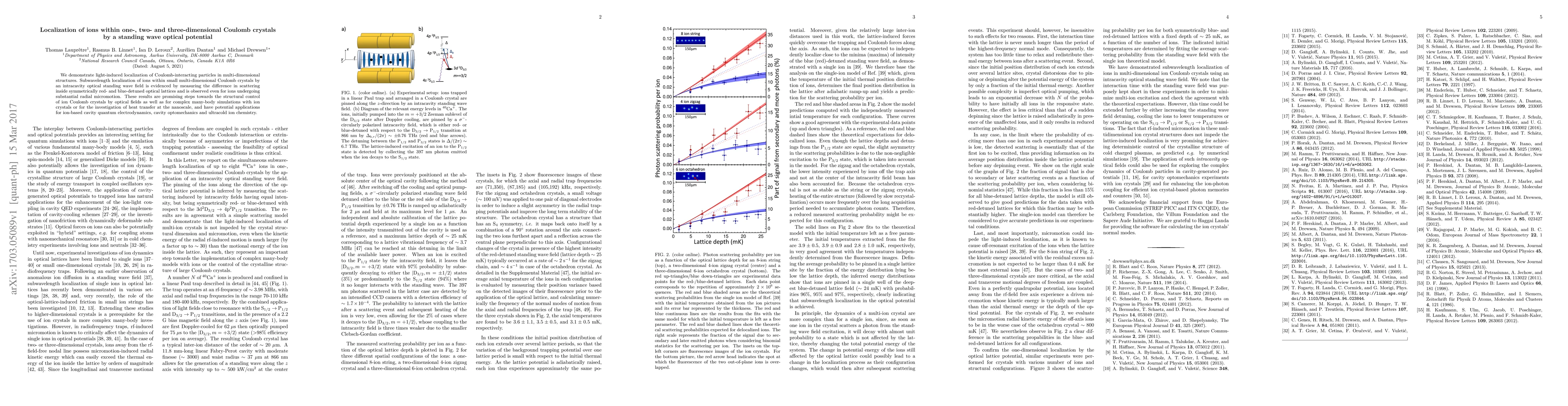 We demonstrate light-induced localization of Coulomb-interacting particles in multi-dimensional structures. Subwavelength localization of ions within small multi-dimensional Coulomb crystals by an intracavity optical standing wave field is evidenced by measuring the difference in scattering inside symmetrically red- and blue-detuned optical lattices and is observed even for ions undergoing substantial radial micromotion. These results are promising steps towards the structural control of ion Coulomb crystals by optical fields as well as for complex many-body simulations with ion crystals or for the investigation of heat transfer at the nanoscale, and have potential applications for ion-based cavity quantum electrodynamics, cavity optomechanics and ultracold ion chemistry.