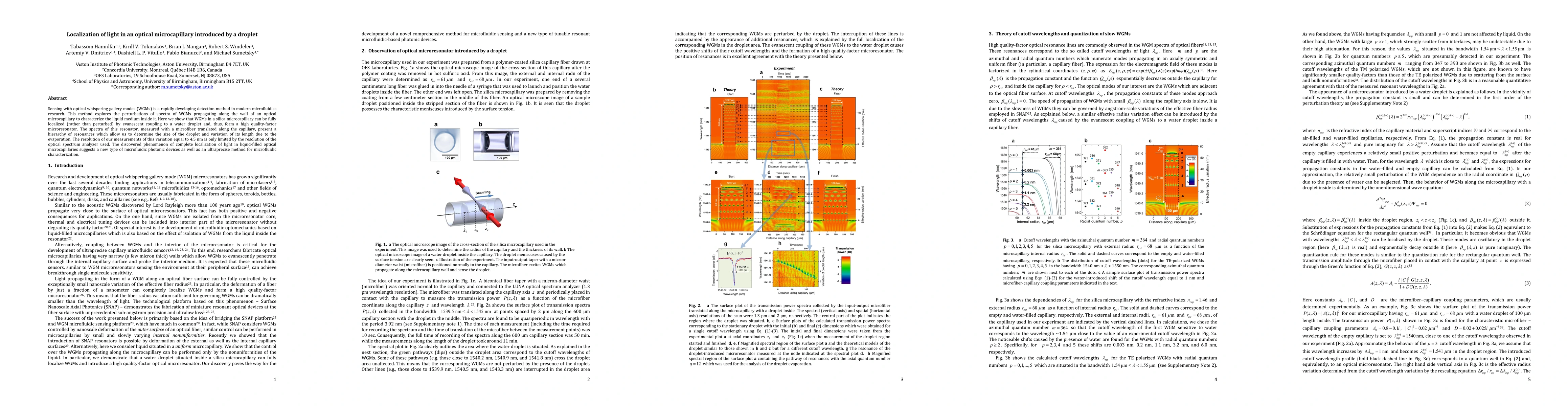 Sensing with optical whispering gallery modes (WGMs) is a rapidly developing detection method in modern microfluidics research. This method explores the perturbations of spectra of WGMs propagating along the wall of an optical microcapillary to characterize the liquid medium inside it. Here we show that WGMs in a silica microcapillary can be fully localized (rather than perturbed) by evanescent coupling to a water droplet and, thus, form a high quality-factor microresonator. The spectra of this resonator, measured with a microfiber translated along the capillary, present a hierarchy of resonances which allow us to determine the size of the droplet and variation of its length due to the evaporation. The resolution of our measurements of this variation equal to 4.5 nm is only limited by the resolution of the optical spectrum analyzer used. The discovered phenomenon of complete localization of light in liquid-filled optical microcapillaries suggests a new type of microfluidic photonic devices as well as an ultraprecise method for microfluidic characterization.