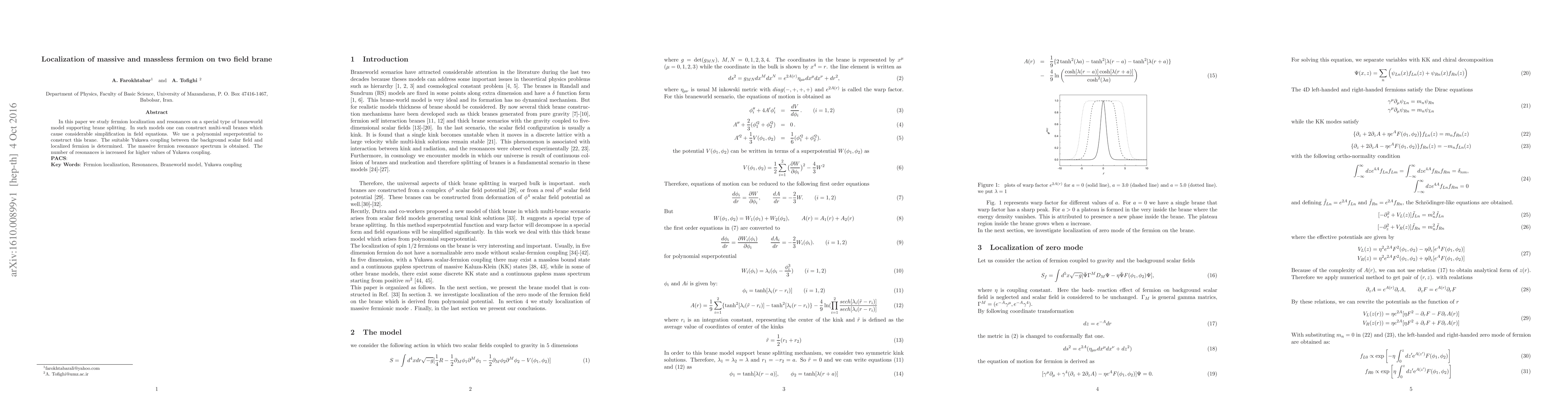 In this paper we study fermion localization and resonances on a special type of braneworld model supporting brane splitting. In such models one can construct multi-wall branes which cause considerable simplification in field equations. We use a polynomial superpotential to construct this brane. The suitable Yukawa coupling between the background scalar field and localized fermion is determined. The massive fermion resonance spectrum is obtained. The number of resonances is increased for higher values of Yukawa coupling.