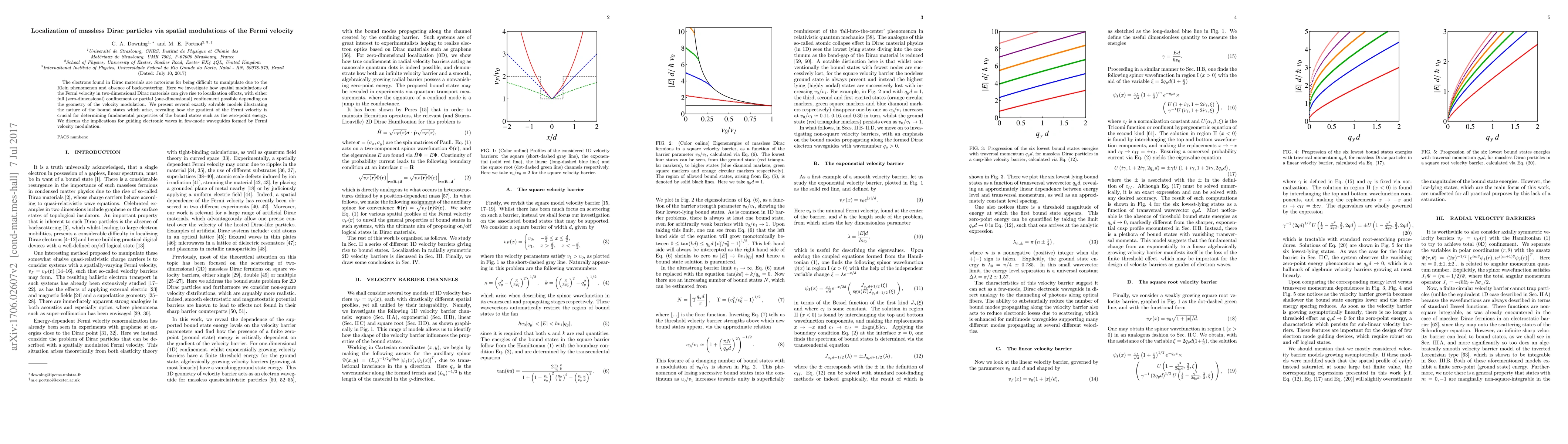 The electrons found in Dirac materials are notorious for being difficult to manipulate due to the Klein phenomenon and absence of backscattering. Here we investigate how spatial modulations of the Fermi velocity in two-dimensional Dirac materials can give rise to localization effects, with either full (zero-dimensional) confinement or partial (one-dimensional) confinement possible depending on the geometry of the velocity modulation. We present several exactly solvable models illustrating the nature of the bound states which arise, revealing how the gradient of the Fermi velocity is crucial for determining fundamental properties of the bound states such as the zero-point energy. We discuss the implications for guiding electronic waves in few-mode waveguides formed by Fermi velocity modulation.