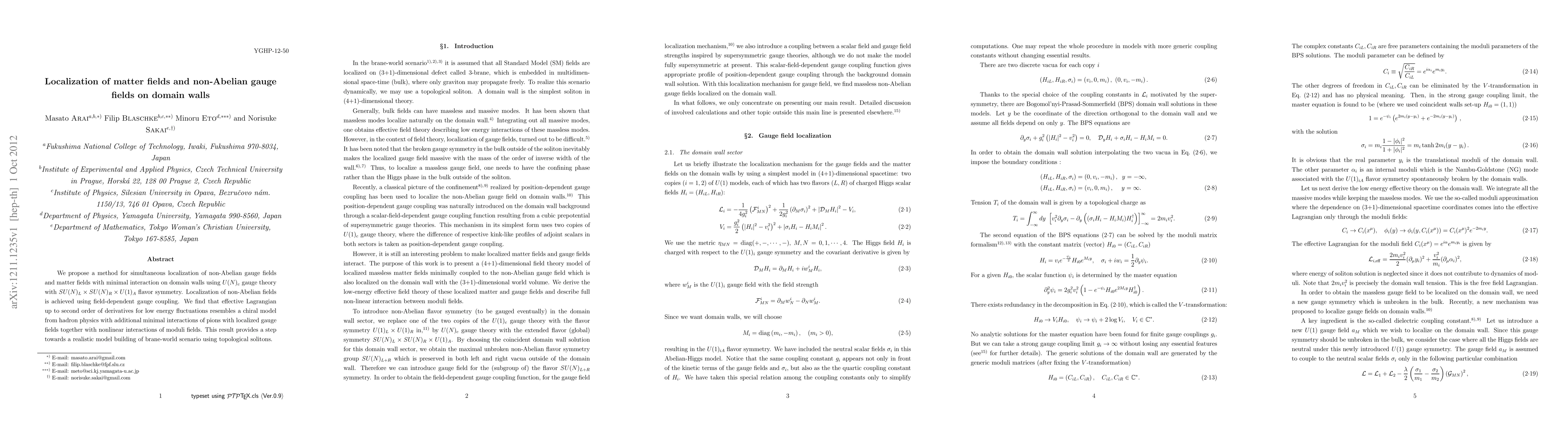 We propose a method for simultaneous localization of non-Abelian gauge fields and matter fields with minimal interaction on domain walls using $U(N)_c$ gauge theory with $SU(N)_{L}\times SU(N)_{R}\times U(1)_{A}$ flavor symmetry. Localization of non-Abelian fields is achieved using field-dependent gauge coupling. We find that effective Lagrangian up to second order of derivatives for low energy fluctuations resembles a chiral model from hadron physics with additional minimal interactions of pions with localized gauge fields together with nonlinear interactions of moduli fields. This result provides a step towards a realistic model building of brane-world scenario using topological solitons.