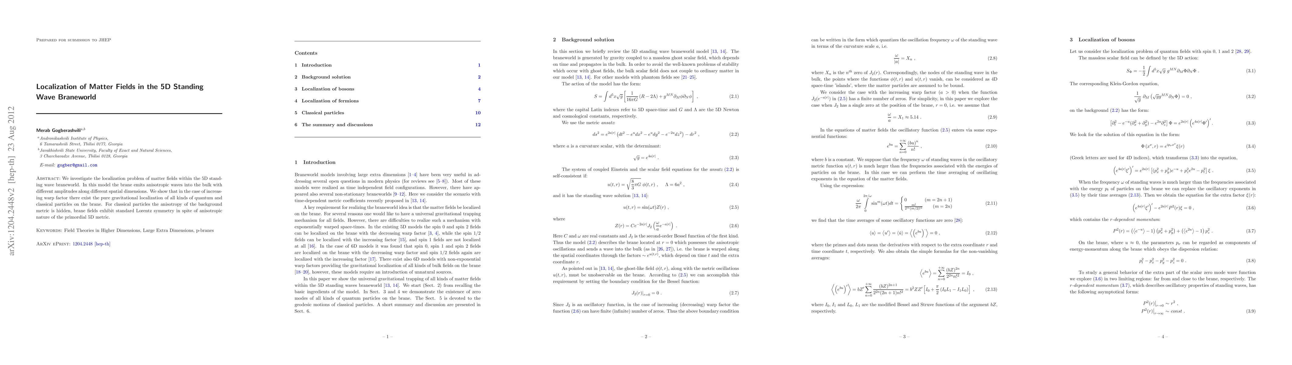 Researchers investigate how matter fields localize in a 5D standing wave braneworld with anisotropic waves. They find that increasing warp factor leads to pure gravitational localization of particles on the brane.