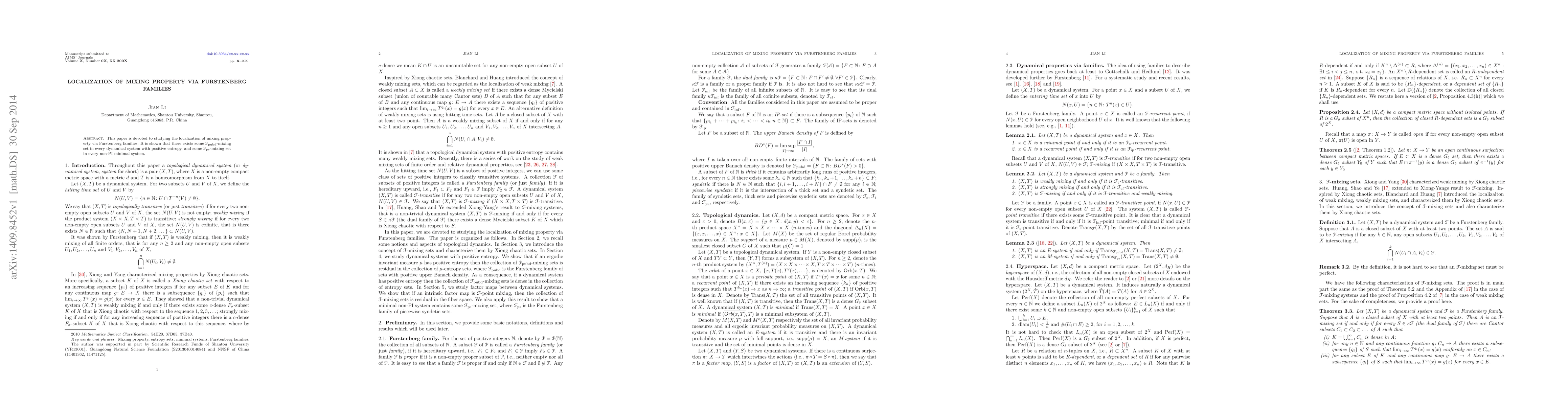 This paper investigates the localization of mixing properties in dynamical systems using Furstenberg families, demonstrating the existence of $\mathscr{F}_{pubd}$-mixing sets in systems with positive entropy and $\mathscr{F}_{ps}$-mixing sets in non-PI minimal systems.