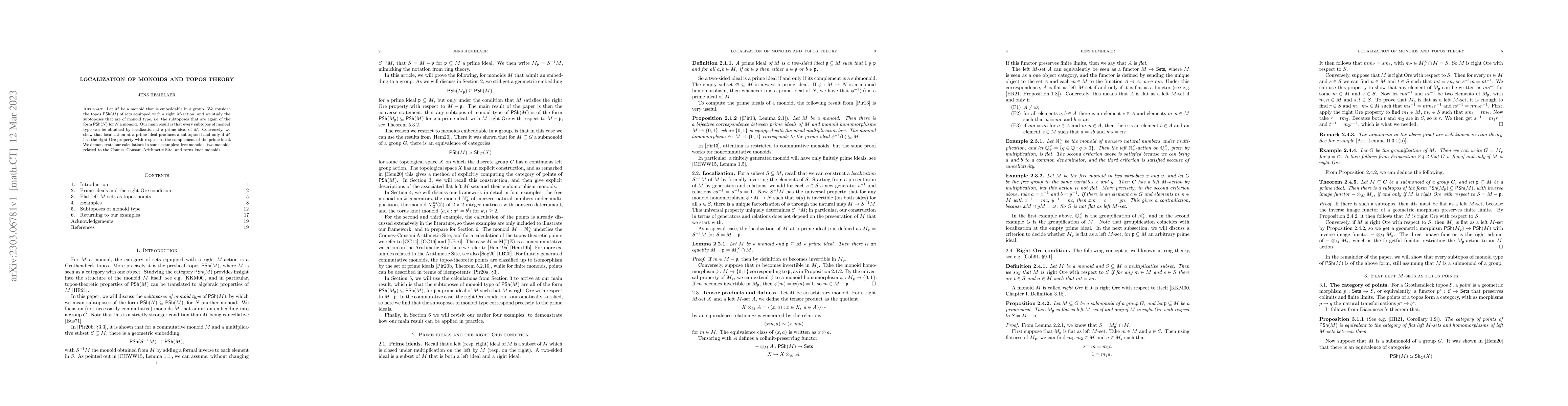 This paper explores the relationship between monoids embeddable in groups and topos theory, focusing on subtoposes of monoid type in $\mathbf{PSh}(M)$. The main result establishes that subtoposes of monoid type correspond to localizations at prime ideals, provided the monoid satisfies the right Ore property with respect to the complement of the prime ideal.