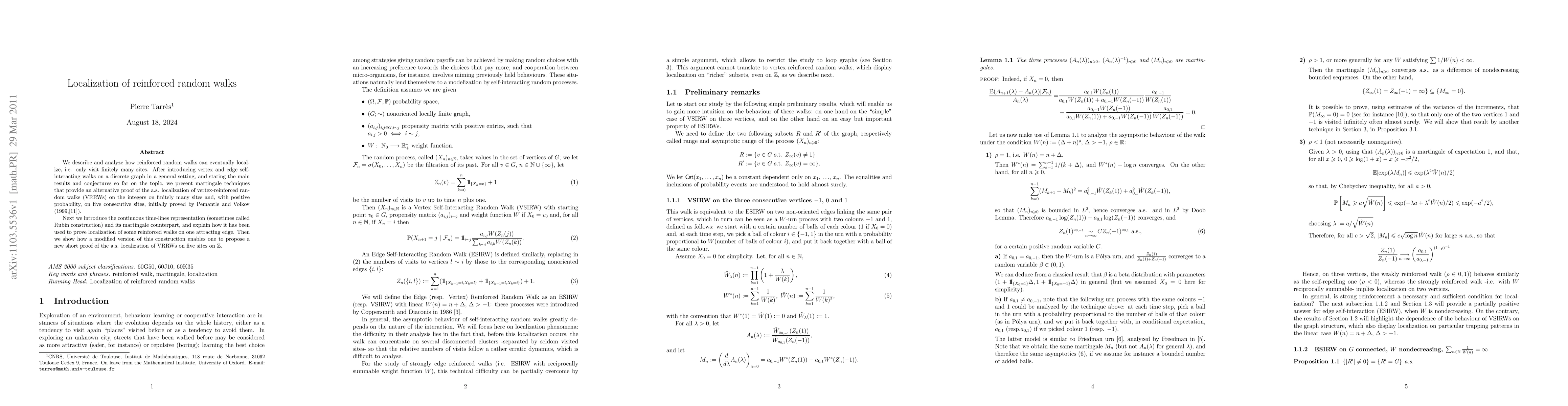 This paper analyzes the localization of reinforced random walks, proving almost sure localization on finitely many sites and, with positive probability, on five consecutive sites on the integers. It introduces martingale techniques and a modified Rubin construction to provide new proofs for these results.