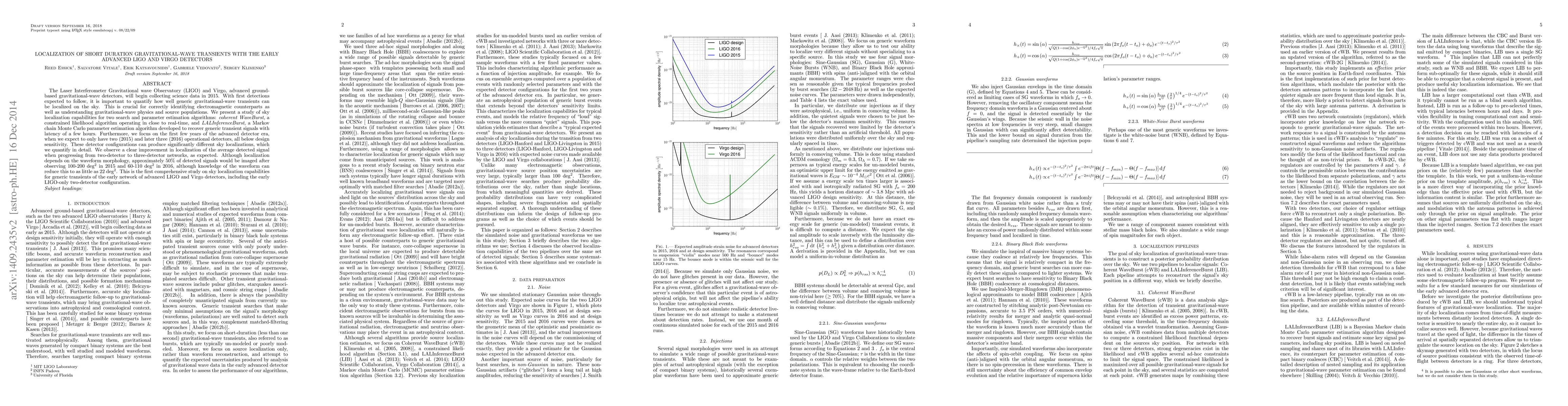 This paper evaluates the sky localization capabilities of the early advanced LIGO and Virgo detectors for short-duration gravitational-wave transients using two algorithms: coherent WaveBurst and LALInferenceBurst. It finds that while localization improves with more operational detectors, approximately 50% of signals would be imaged within 100-200 deg$^2$ in 2015 and 60-110 deg$^2$ in 2016, with waveform knowledge reducing this area significantly.