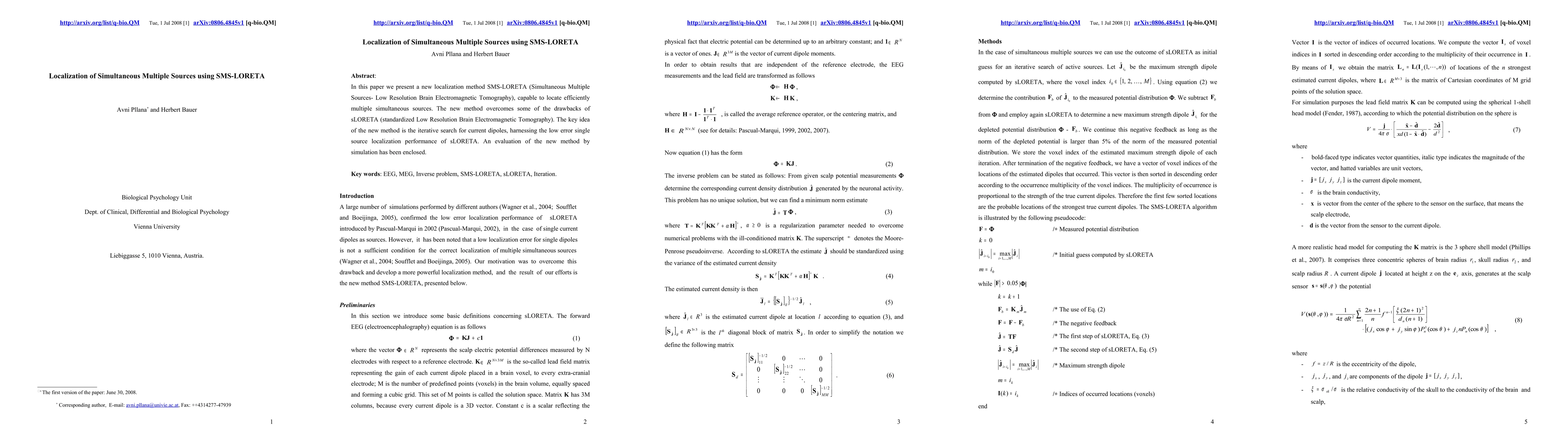 This paper introduces SMS-LORETA, a new method for efficiently localizing multiple simultaneous sources, overcoming some limitations of sLORETA. It utilizes an iterative search for current dipoles, leveraging the high accuracy of sLORETA for single source localization, and is evaluated through simulations.
