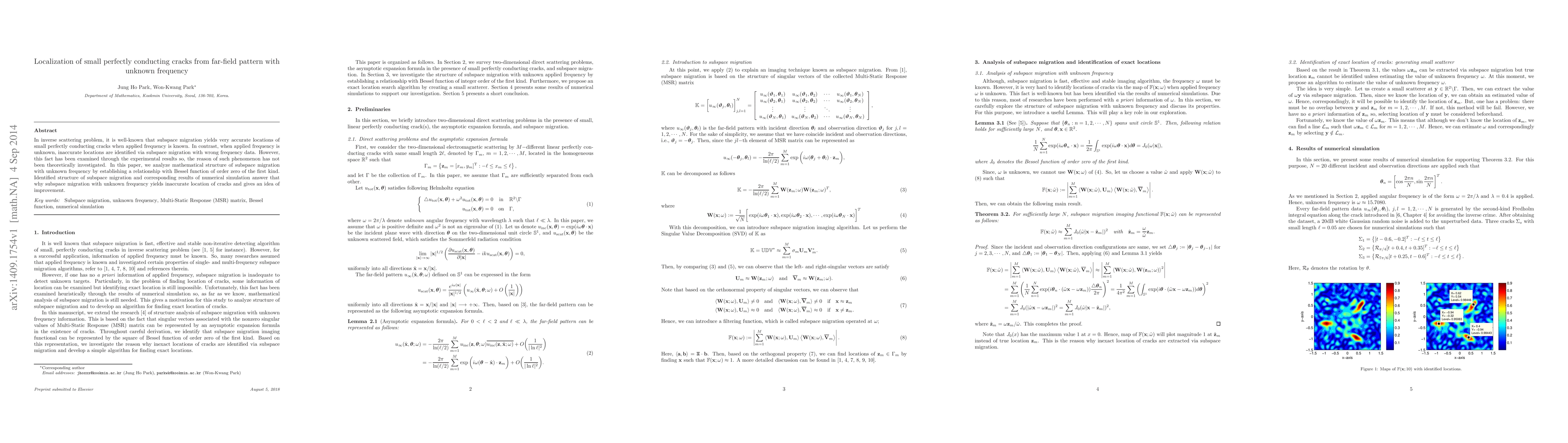 In inverse scattering problem, it is well-known that subspace migration yields very accurate locations of small perfectly conducting cracks when applied frequency is known. In contrast, when applied frequency is unknown, inaccurate locations are identified via subspace migration with wrong frequency data. However, this fact has been examined through the experimental results so, the reason of such phenomenon has not been theoretically investigated. In this paper, we analyze mathematical structure of subspace migration with unknown frequency by establishing a relationship with Bessel function of order zero of the first kind. Identified structure of subspace migration and corresponding results of numerical simulation answer that why subspace migration with unknown frequency yields inaccurate location of cracks and gives an idea of improvement.