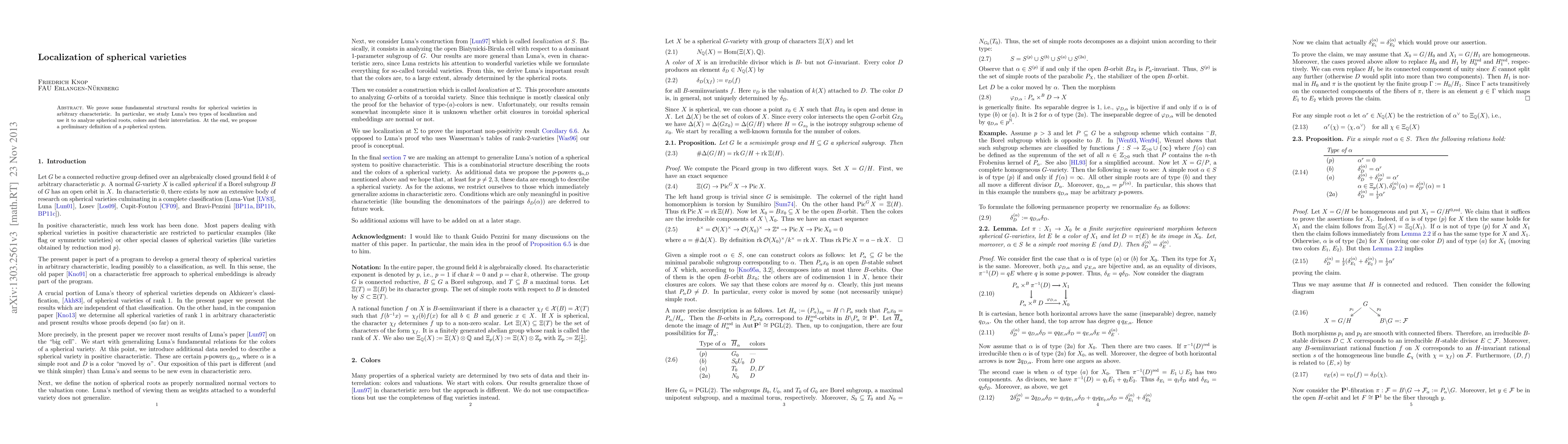 This paper establishes key structural results for spherical varieties in any characteristic, focusing on Luna's localization techniques to explore spherical roots, colors, and their connections. It concludes with an initial definition of a p-spherical system.