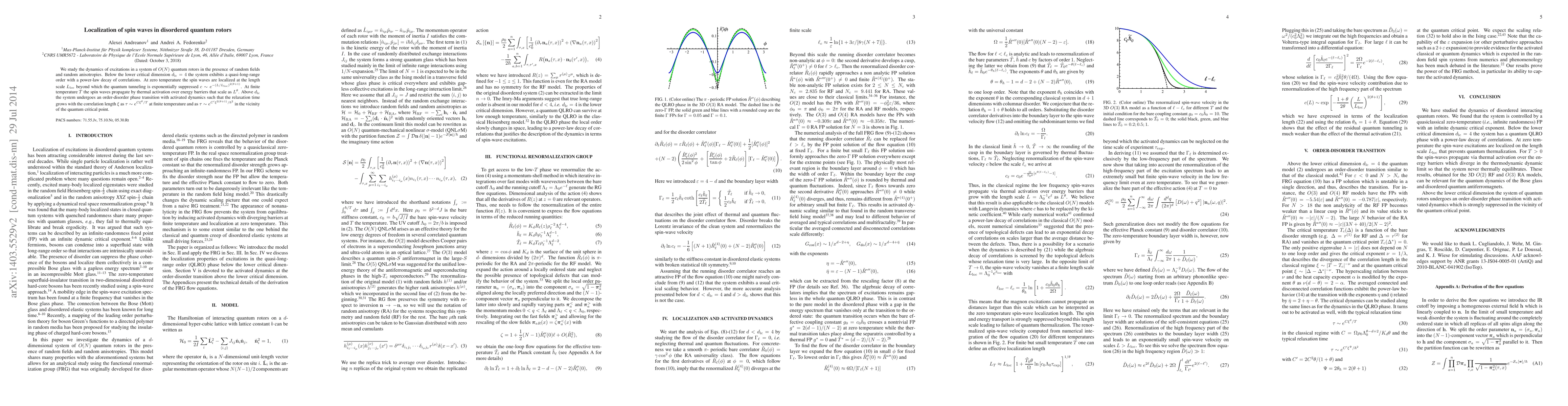 We study the dynamics of excitations in a system of $O(N)$ quantum rotors in the presence of random fields and random anisotropies. Below the lower critical dimension $d_{\mathrm{lc}}=4$ the system exhibits a quasi-long-range order with a power-law decay of correlations. At zero temperature the spin waves are localized at the length scale $L_{\mathrm{loc}}$ beyond which the quantum tunneling is exponentially suppressed $ c \sim e^{-(L/L_{\mathrm{loc}})^{2(\theta+1)}}$. At finite temperature $T$ the spin waves propagate by thermal activation over energy barriers that scales as $L^{\theta}$. Above $d_{\mathrm{lc}}$ the system undergoes an order-disorder phase transition with activated dynamics such that the relaxation time grows with the correlation length $\xi$ as $\tau \sim e^{C \xi^\theta/T}$ at finite temperature and as $\tau \sim e^{C' \xi^{2(\theta+1)}/\hbar^2}$ in the vicinity of the quantum critical point.