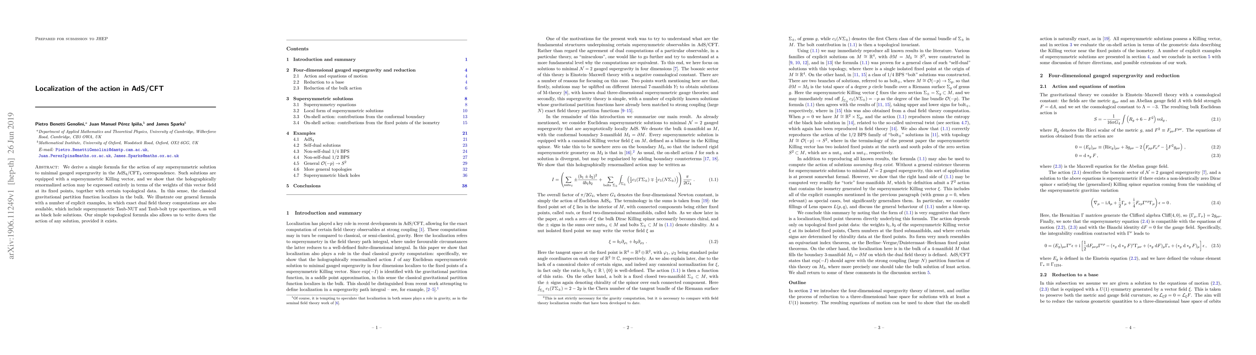 We derive a simple formula for the action of any supersymmetric solution to minimal gauged supergravity in the AdS$_4$/CFT$_3$ correspondence. Such solutions are equipped with a supersymmetric Killing vector, and we show that the holographically renormalized action may be expressed entirely in terms of the weights of this vector field at its fixed points, together with certain topological data. In this sense, the classical gravitational partition function localizes in the bulk. We illustrate our general formula with a number of explicit examples, in which exact dual field theory computations are also available, which include supersymmetric Taub-NUT and Taub-bolt type spacetimes, as well as black hole solutions. Our simple topological formula also allows us to write down the action of any solution, provided it exists.