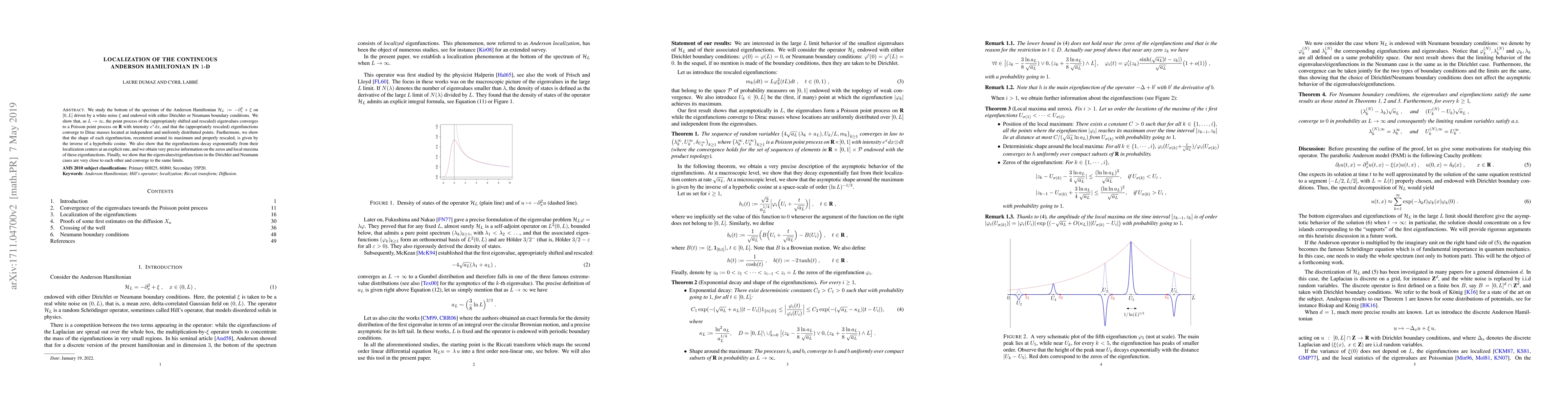 We study the bottom of the spectrum of the Anderson Hamiltonian $\mathcal{H}_L := -\partial_x^2 + \xi$ on $[0,L]$ driven by a white noise $\xi$ and endowed with either Dirichlet or Neumann boundary conditions. We show that, as $L\rightarrow\infty$, the point process of the (appropriately shifted and rescaled) eigenvalues converges to a Poisson point process on $\mathbb{R}$ with intensity $e^x dx$, and that the (appropriately rescaled) eigenfunctions converge to Dirac masses located at independent and uniformly distributed points. Furthermore, we show that the shape of each eigenfunction, recentered around its maximum and properly rescaled, is given by the inverse of a hyperbolic cosine. We also show that the eigenfunctions decay exponentially from their localization centers at an explicit rate, and we obtain very precise information on the zeros and local maxima of these eigenfunctions. Finally, we show that the eigenvalues/eigenfunctions in the Dirichlet and Neumann cases are very close to each other and converge to the same limits.
