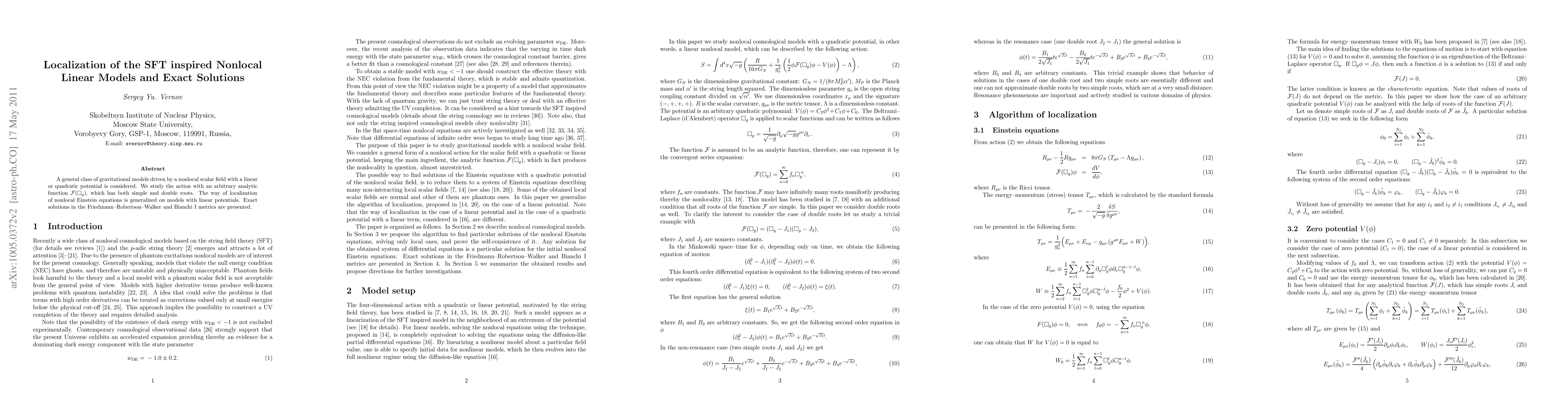 A general class of gravitational models driven by a nonlocal scalar field with a linear or quadratic potential is considered. We study the action with an arbitrary analytic function $F(\Box)$, which has both simple and double roots. The way of localization of nonlocal Einstein equations is generalized on models with linear potentials. Exact solutions in the Friedmann-Robertson-Walker and Bianchi I metrics are presented.