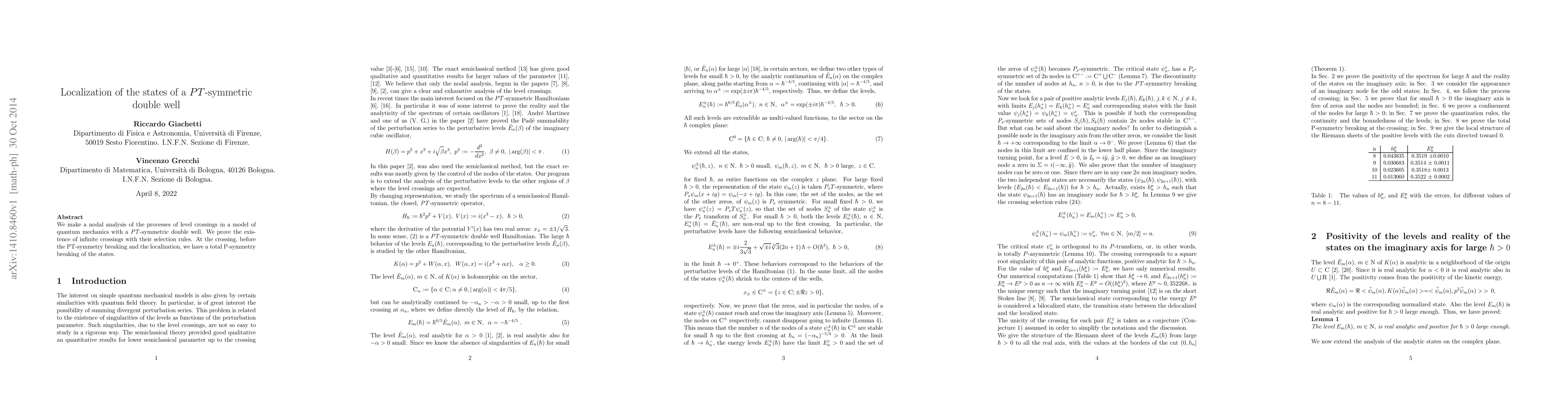 We make a nodal analysis of the processes of level crossings in a model of quantum mechanics with a PT-symmetric double well. We prove the existence of infinite crossings with their selection rules. At the crossing, before the PT-symmetry breaking and the localization, we have a total P-symmetry breaking of the states.