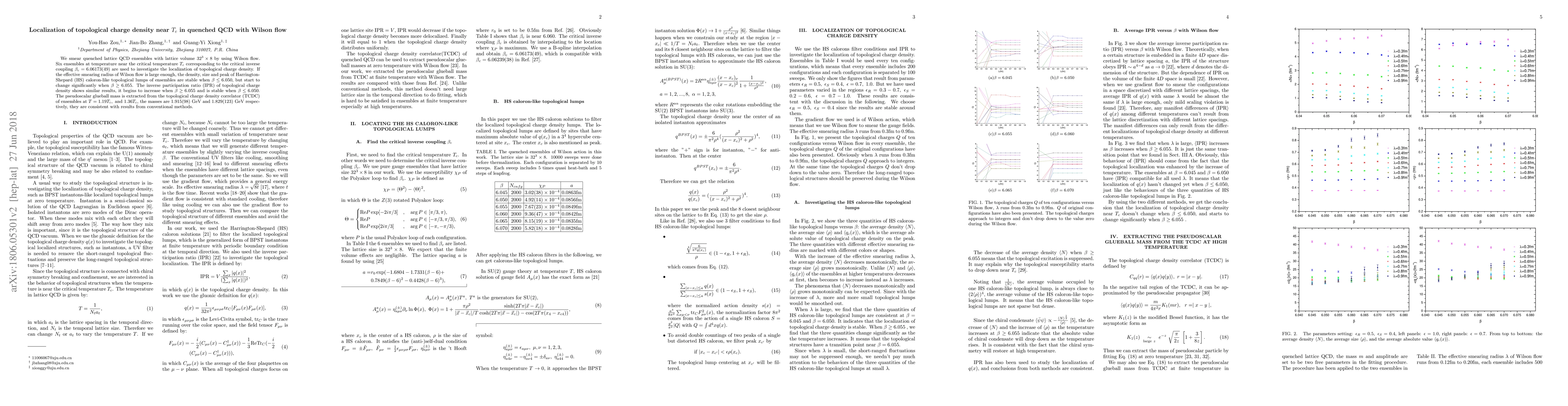 We smear quenched lattice QCD ensembles with lattice volume $32^3\times 8$ by using Wilson flow. Six ensembles at temperature near the critical temperature $T_c$ corresponding to the critical inverse coupling $\beta_c=6.06173(49)$ are used to investigate the localization of topological charge density. If the effective smearing radius of Wilson flow is large enough, the density, size and peak of Harrington-Shepard (HS) caloron-like topological lumps of ensembles are stable when $\beta\leq 6.050$, but start to change significantly when $\beta\geq6.055$. The inverse participation ratio (IPR) of topological charge density shows similar results, it begins to increase when $\beta\geq 6.055$ and is stable when $\beta\leq 6.050$. The pseudoscalar glueball mass is extracted from the topological charge density correlator (TCDC) of ensembles at $T=1.19T_c,~\textrm{and }1.36T_c$, the masses are $1.915(98)\textrm{ GeV}$ and $1.829(123)\textrm{ GeV}$ respectively, they are consistent with results from conventional methods.