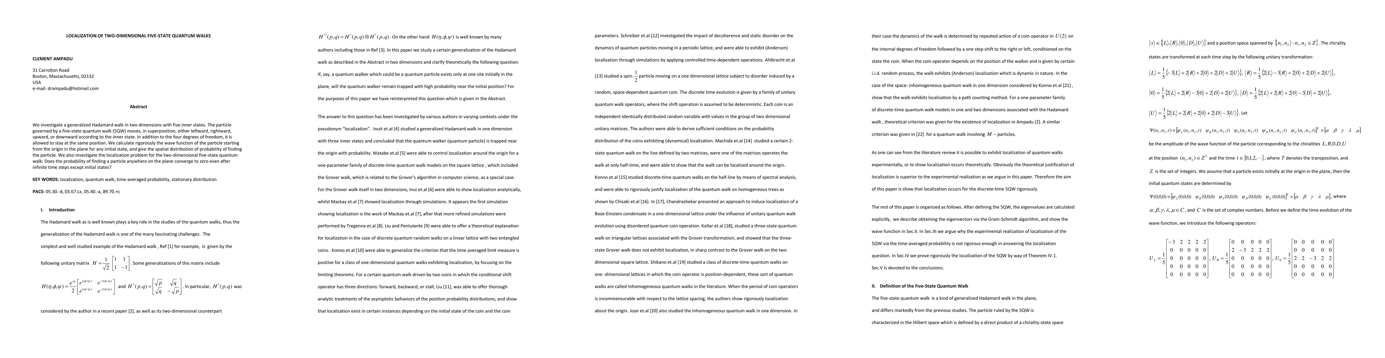 This work extends previous research on quantum walks by considering a five-state model in two dimensions, providing new insights into localization properties of quantum walks.