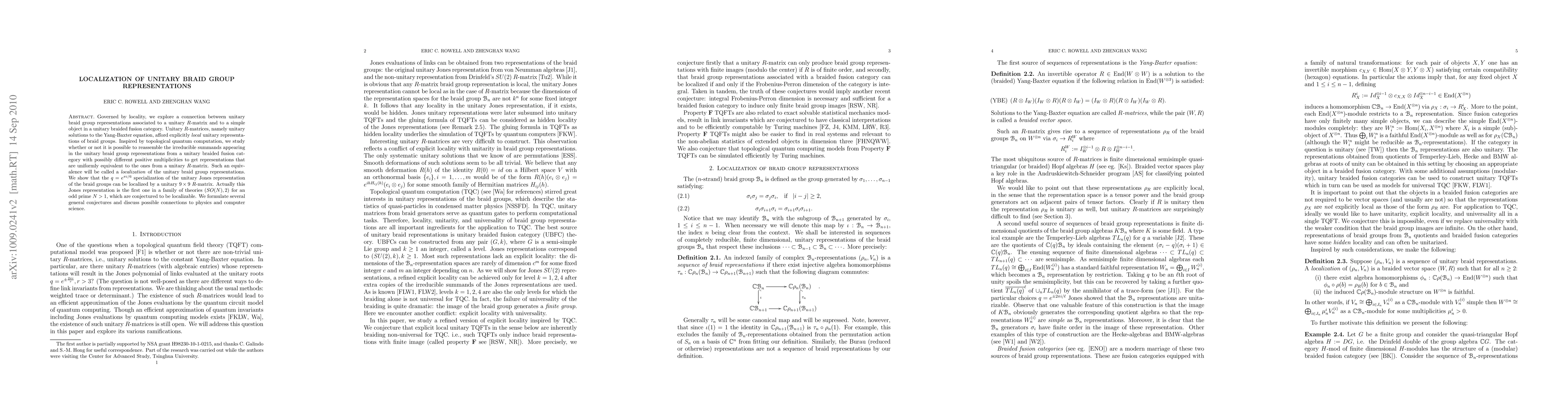 Governed by locality, we explore a connection between unitary braid group representations associated to a unitary $R$-matrix and to a simple object in a unitary braided fusion category. Unitary $R$-matrices, namely unitary solutions to the Yang-Baxter equation, afford explicitly local unitary representations of braid groups. Inspired by topological quantum computation, we study whether or not it is possible to reassemble the irreducible summands appearing in the unitary braid group representations from a unitary braided fusion category with possibly different positive multiplicities to get representations that are uniformly equivalent to the ones from a unitary R-matrix. Such an equivalence will be called a localization of the unitary braid group representations. We show that the q=exp(\pi i/6) specialization of the unitary Jones representation of the braid groups can be localized by a unitary $9\times 9$ R-matrix. Actually this Jones representation is the first one in a family of theories (SO(N),2) for an odd prime N>1, which are conjectured to be localizable. We formulate several general conjectures and discuss possible connections to physics and computer science.