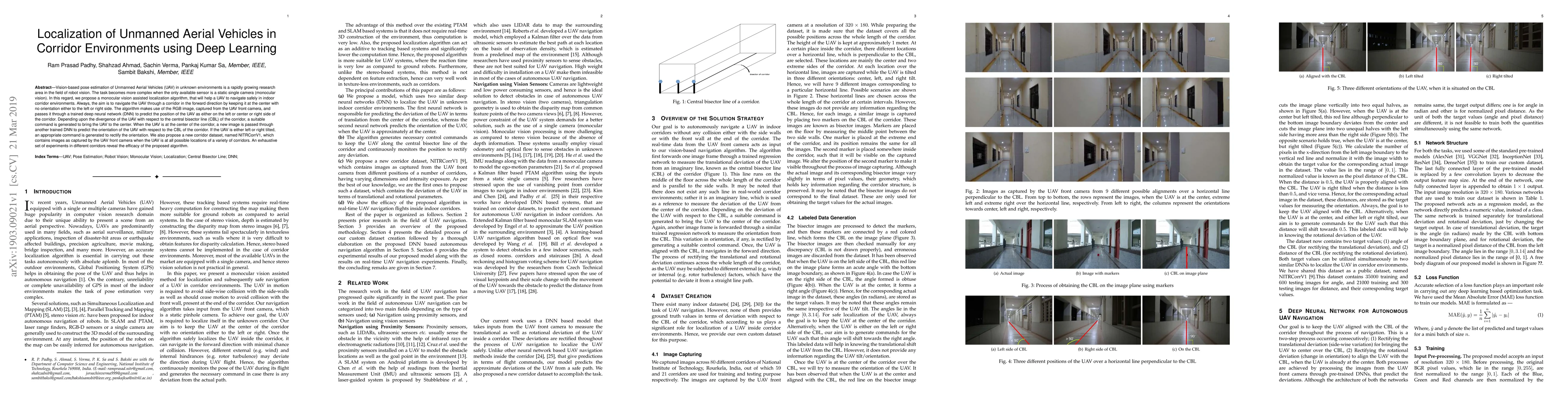 This paper proposes a deep learning-based localization algorithm for Unmanned Aerial Vehicles (UAV) navigating in indoor corridors using a single static camera. The algorithm predicts UAV position and orientation via trained deep neural networks, generating commands to keep the UAV centered and oriented correctly. A new dataset, NITRCorrV1, is introduced for training and testing the algorithm, demonstrating its effectiveness in various corridor environments.