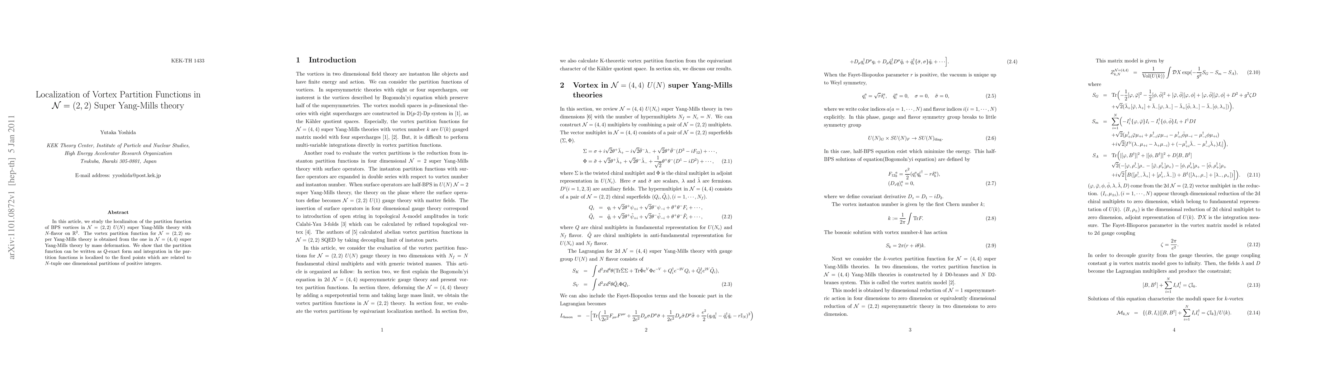 Summary: This paper investigates the localization of the partition function for BPS vortices in $\mathcal{N}=(2,2)$ super Yang-Mills theory, demonstrating its localization to fixed points related to $N$-tuple one-dimensional partitions of positive integers, derived from $\mathcal{N}=(4,4)$ super Yang-Mills theory via mass deformation.