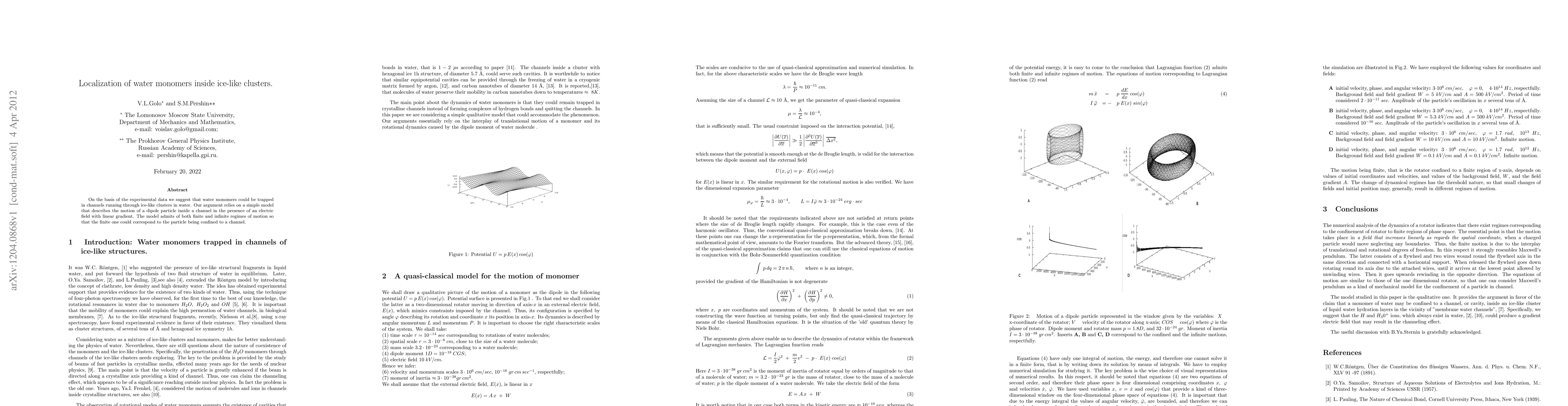 On the basis of the experimental data we suggest that water monomers could be trapped in channels running through ice-like clusters in water. Our argument relies on a simple model that describes the motion of a dipole particle inside a channel in the presence of an electric field with linear gradient. The model admits of both finite and infinite regimes of motion so that the finite one could correspond to the particle being confined to a channel.