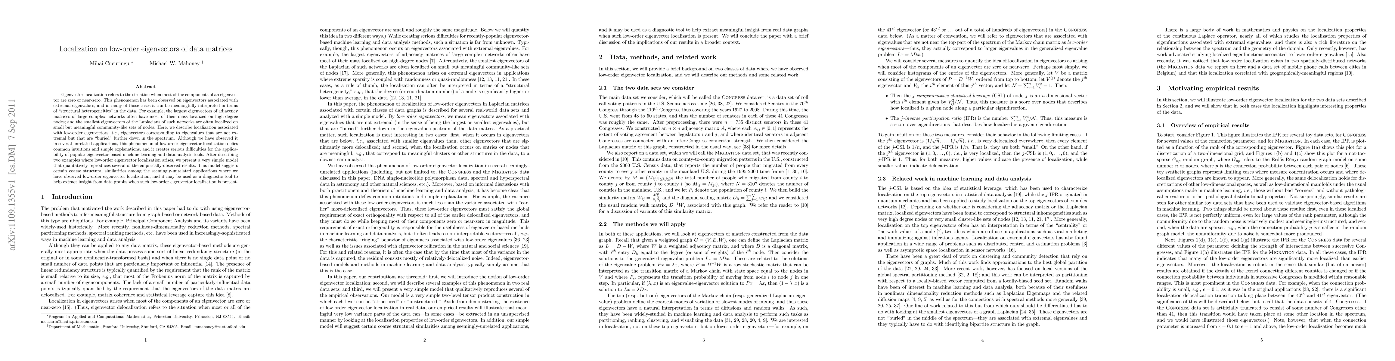 This paper investigates the phenomenon of eigenvector localization on low-order eigenvectors of data matrices, which challenges conventional understanding and complicates the use of eigenvector-based tools. The authors present two examples and propose a simple model to explain the observed localization, suggesting structural similarities across different applications.
