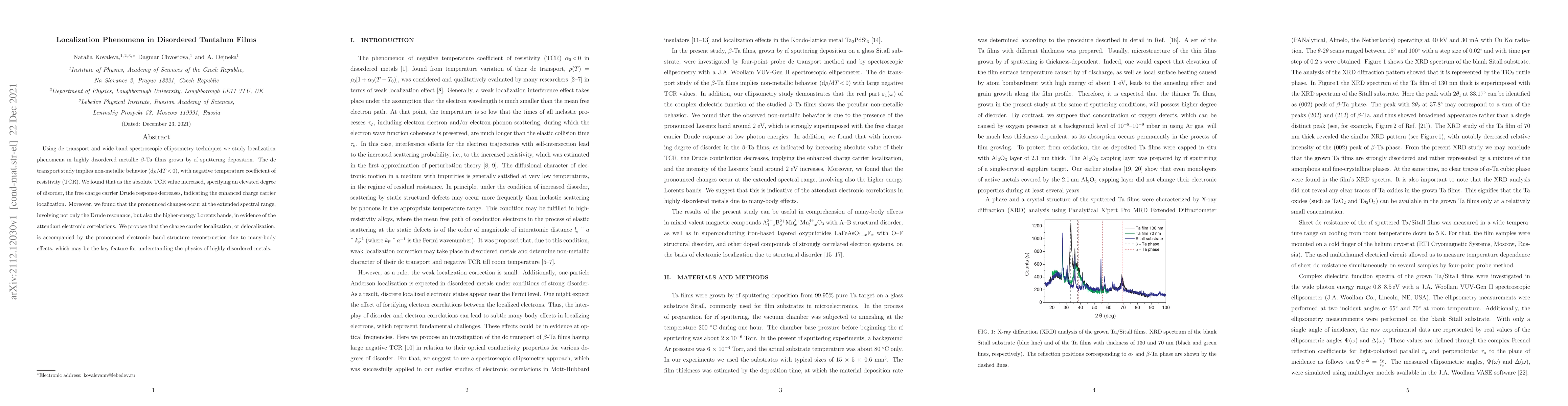 Using dc transport and wide-band spectroscopic ellipsometry techniques we study localization phenomena in highly disordered metallic \beta-Ta films grown by rf sputtering deposition. The dc transport study implies non-metallic behavior (dr/dT<0), with negative temperature coefficient of resistivity (TCR). We found that as the absolute TCR value increased, specifying an elevated degree of disorder, the free charge carrier Drude response decreases, indicating the enhanced charge carrier localization. Moreover, we found that the pronounced changes occur at the extended spectral range, involving not only the Drude resonance, but also the higher-energy Lorentz bands, in evidence of the attendant electronic correlations. We propose that the charge carrier localization, or delocalization, is accompanied by the pronounced electronic band structure reconstruction due to many-body effects, which may be the key feature for understanding the physics of highly disordered metals.