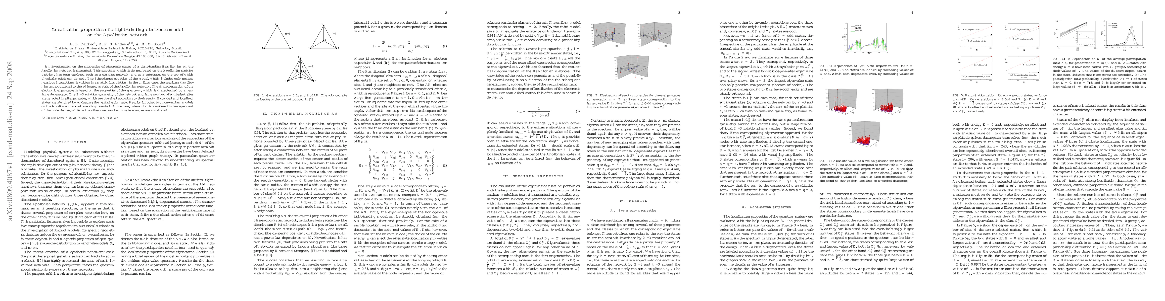 An investigation on the properties of electronic states of a tight-binding Hamiltonian on the Apollonian network is presented. This structure, which is defined based on the Apollonian packing problem, has been explored both as a complex network, and as a substrate, on the top of which physical models can defined. The Schrodinger equation of the model, which includes only nearest neighbor interactions, is written in a matrix formulation. In the uniform case, the resulting Hamiltonian is proportional to the adjacency matrix of the Apollonian network. The characterization of the electronic eigenstates is based on the properties of the spectrum, which is characterized by a very large degeneracy. The $2\pi /3$ rotation symmetry of the network and large number of equivalent sites are reflected in all eigenstates, which are classified according to their parity. Extended and localized states are identified by evaluating the participation rate. Results for other two non-uniform models on the Apollonian network are also presented. In one case, interaction is considered to be dependent of the node degree, while in the other one, random on-site energies are considered.