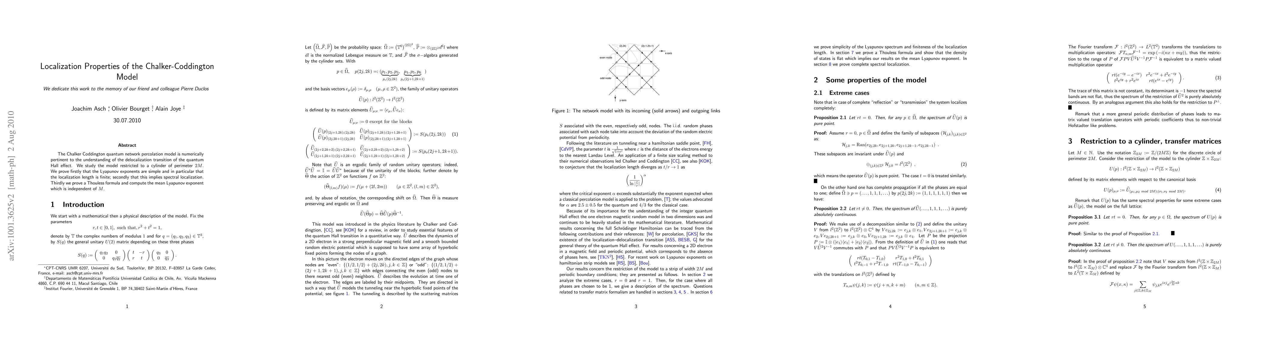 The Chalker Coddington quantum network percolation model is numerically pertinent to the understanding of the delocalization transition of the quantum Hall effect. We study the model restricted to a cylinder of perimeter 2M. We prove firstly that the Lyapunov exponents are simple and in particular that the localization length is finite; secondly that this implies spectral localization. Thirdly we prove a Thouless formula and compute the mean Lyapunov exponent which is independent of M.