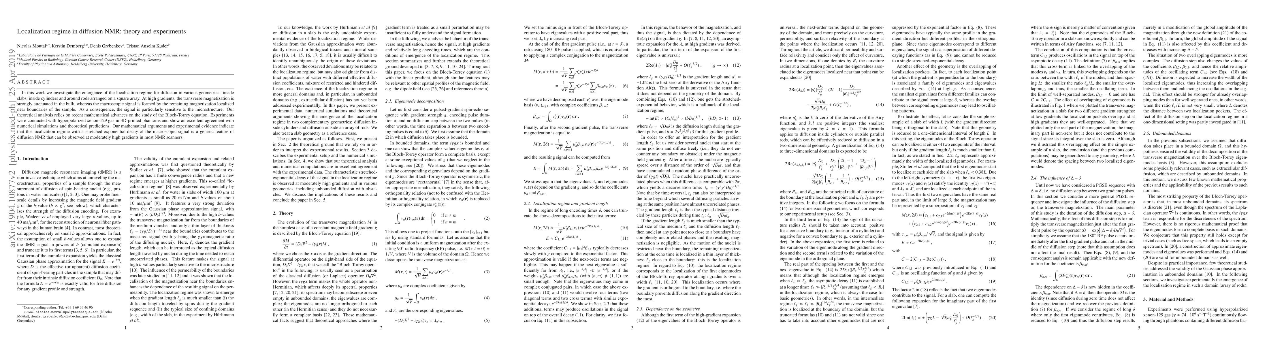 In this work we investigate the emergence of the localization regime for diffusion in various geometries: inside slabs, inside cylinders and around rods arranged on a square array. At high gradients, the transverse magnetization is strongly attenuated in the bulk, whereas the macroscopic signal is formed by the remaining magnetization localized near boundaries of the sample. As a consequence, the signal is particularly sensitive to the microstructure. Our theoretical analysis relies on recent mathematical advances on the study of the Bloch-Torrey equation. Experiments were conducted with hyperpolarized xenon-129 gas in 3D-printed phantoms and show an excellent agreement with numerical simulations and theoretical predictions. Our mathematical arguments and experimental evidence indicate that the localization regime with a stretched-exponential decay of the macroscopic signal is a generic feature of diffusion NMR that can be observed at moderately high gradients in most NMR scanners.