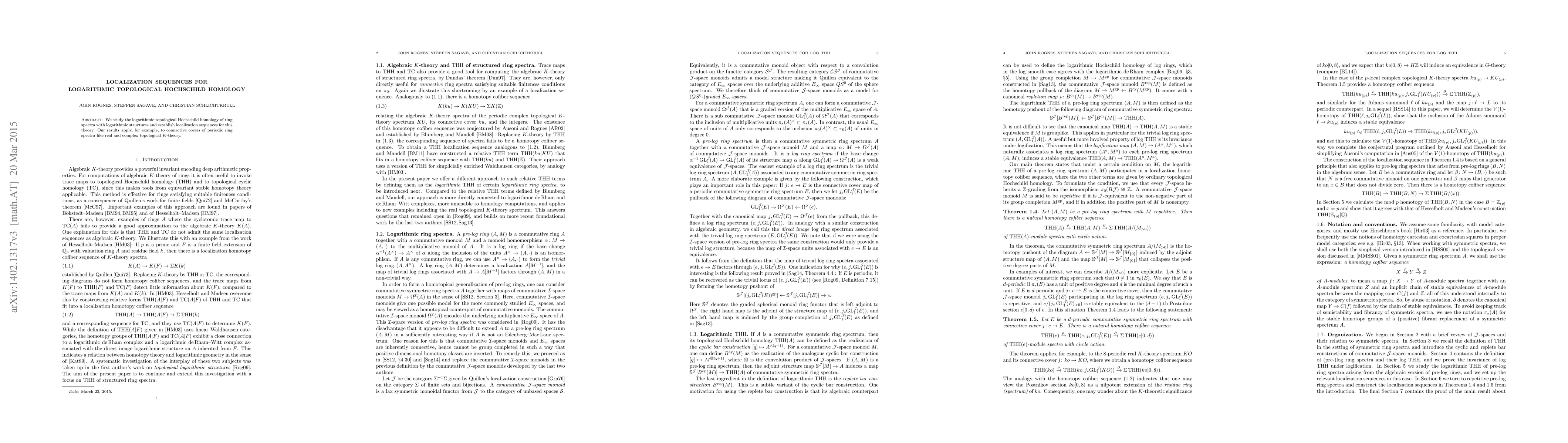 This paper establishes localization sequences for logarithmic topological Hochschild homology of ring spectra with logarithmic structures, demonstrating applications to connective covers of periodic ring spectra such as real and complex topological K-theory.
