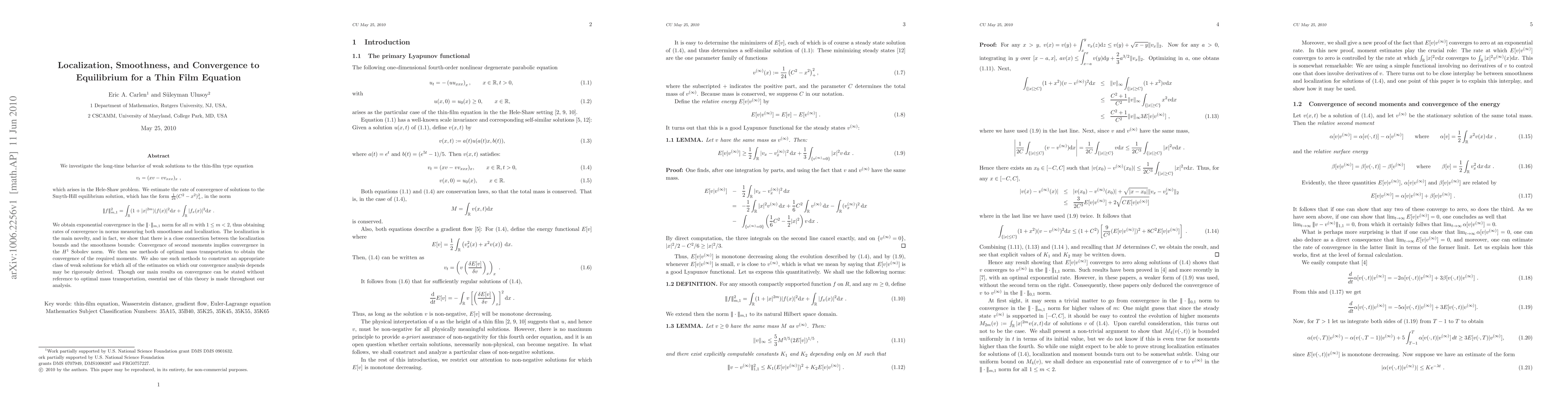 We investigate the long-time behavior of weak solutions to the thin-film type equation $$v_t =(xv - vv_{xxx})_x\ ,$$ which arises in the Hele-Shaw problem. We estimate the rate of convergence of solutions to the Smyth-Hill equilibrium solution, which has the form $\frac{1}{24}(C^2-x^2)^2_+$, in the norm $$|\!|\!| f |\!|\!|_{m,1}^2 = \int_{\R}(1+ |x|^{2m})|f(x)|^2\dd x + \int_{\R}|f_x(x)|^2\dd x\ .$$ We obtain exponential convergence in the $|\!|\!| \cdot |\!|\!|_{m,1}$ norm for all $m$ with $1\leq m< 2$, thus obtaining rates of convergence in norms measuring both smoothness and localization. The localization is the main novelty, and in fact, we show that there is a close connection between the localization bounds and the smoothness bounds: Convergence of second moments implies convergence in the $H^1$ Sobolev norm. We then use methods of optimal mass transportation to obtain the convergence of the required moments. We also use such methods to construct an appropriate class of weak solutions for which all of the estimates on which our convergence analysis depends may be rigorously derived. Though our main results on convergence can be stated without reference to optimal mass transportation, essential use of this theory is made throughout our analysis.