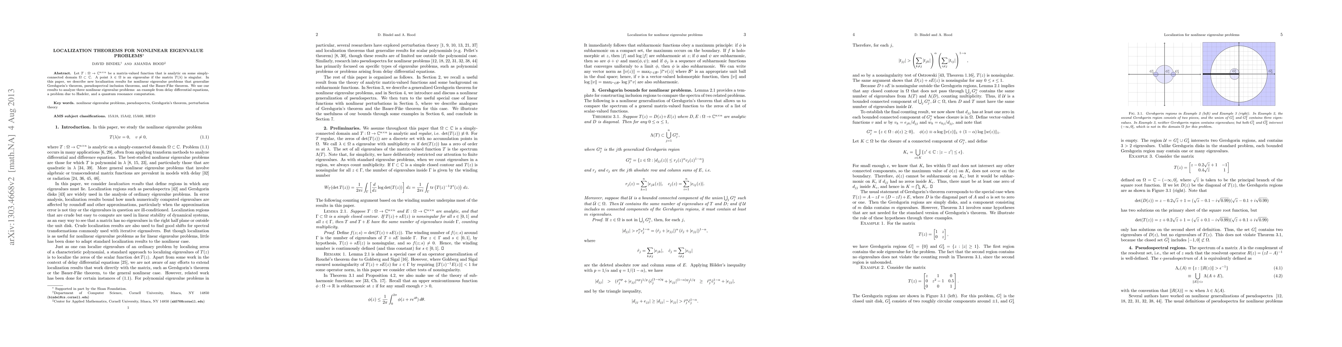 This paper presents new localization results for nonlinear eigenvalue problems, generalizing Gershgorin's theorem and others, to analyze three specific cases in delay differential equations, Hadeler's problem, and quantum resonance computation.