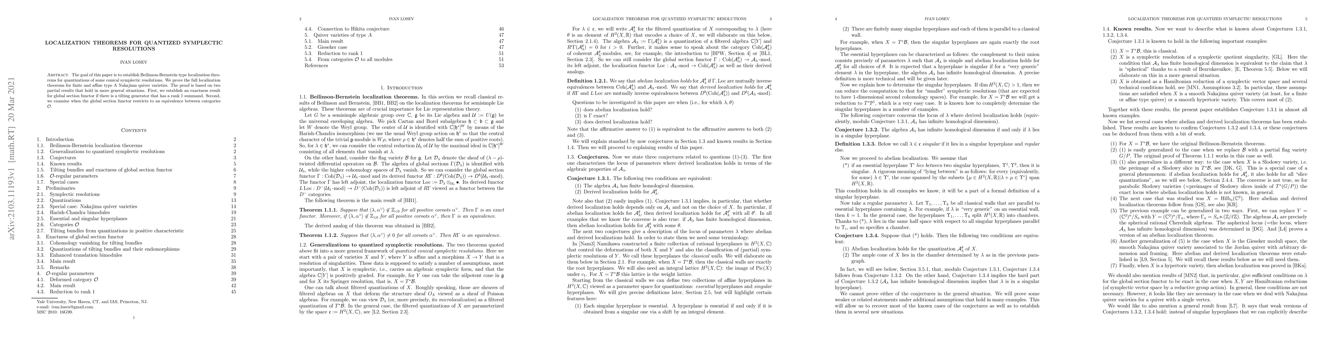 The goal of this paper is to establish Beilinson-Bernstein type localization theorems for quantizations of some conical symplectic resolutions. We prove the full localization theorems for finite and affine type A Nakajima quiver varieties. The proof is based on two partial results that hold in more general situations. First, we establish an exactness result for global section functor if there is a tilting generator that has a rank 1 summand. Second, we examine when the global section functor restricts to an equivalence between categories $\mathcal{O}$.