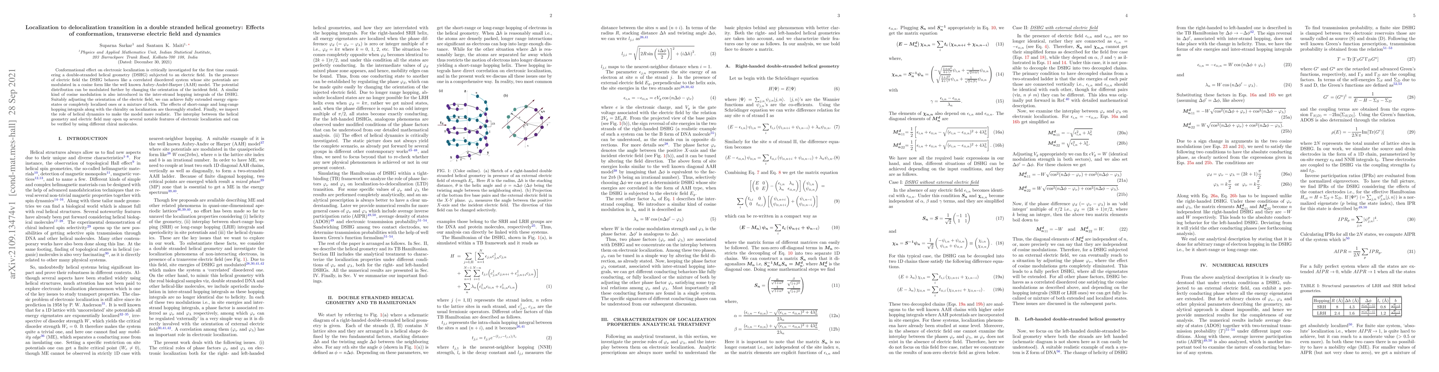 This paper investigates the transition from electronic localization to delocalization in double-stranded helical geometries under the influence of an electric field, revealing how conformation, field orientation, and dynamics affect site potentials and hopping integrals. The study finds that adjusting the electric field orientation can modulate energy eigenstates, highlighting potential applications in chiral molecules.
