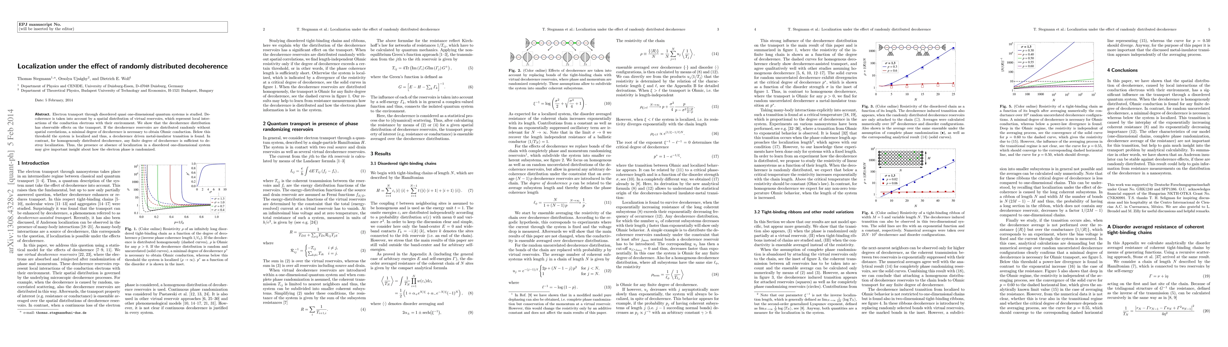 Electron transport through disordered quasi one-dimensional quantum systems is studied. Decoherence is taken into account by a spatial distribution of virtual reservoirs, which represent local interactions of the conduction electrons with their environment. We show that the decoherence distribution has observable effects on the transport. If the decoherence reservoirs are distributed randomly without spatial correlations, a minimal degree of decoherence is necessary to obtain Ohmic conduction. Below this threshold the system is localized and thus, a decoherence driven metal-insulator transition is found. In contrast, for homogenously distributed decoherence, any finite degree of decoherence is sufficient to destroy localization. Thus, the presence or absence of localization in a disordered one-dimensional system may give important insight about how the electron phase is randomized.
