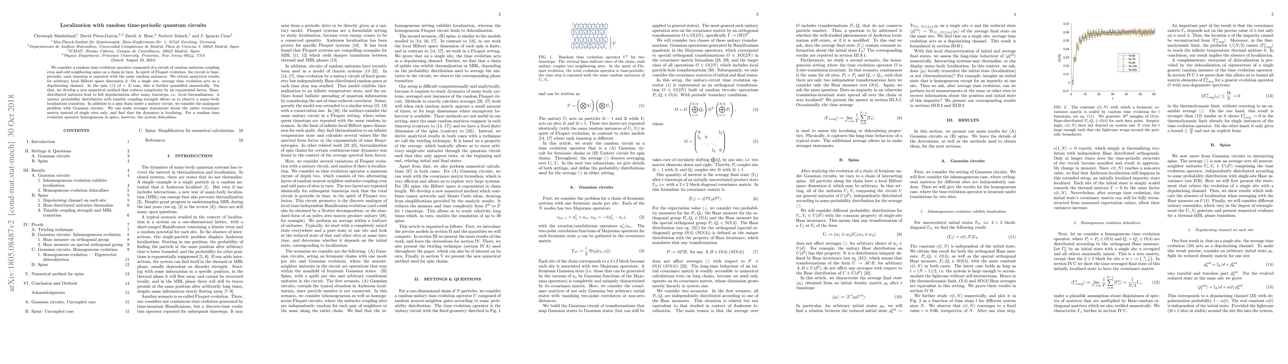 We consider a random time evolution operator composed of a circuit of random unitaries coupling even and odd neighboring spins on a chain in turn. In spirit of Floquet evolution, the circuit is time-periodic; each timestep is repeated with the same random instances. We obtain analytical results for arbitrary local Hilbert space dimension d: On a single site, average time evolution acts as a depolarising channel. In the spin 1/2 (d=2) case, this is further quantified numerically. For that, we develop a new numerical method that reduces complexity by an exponential factor. Haar-distributed unitaries lead to full depolarization after many timesteps, i.e. local thermalization. A unitary probability distribution with tunable coupling strength allows us to observe a many-body localization transition. In addition to a spin chain under a unitary circuit, we consider the analogous problem with Gaussian circuits. We can make stronger statements about the entire covariance matrix instead of single sites only, and find that the dynamics is localising. For a random time evolution operator homogeneous in space, however, the system delocalizes.