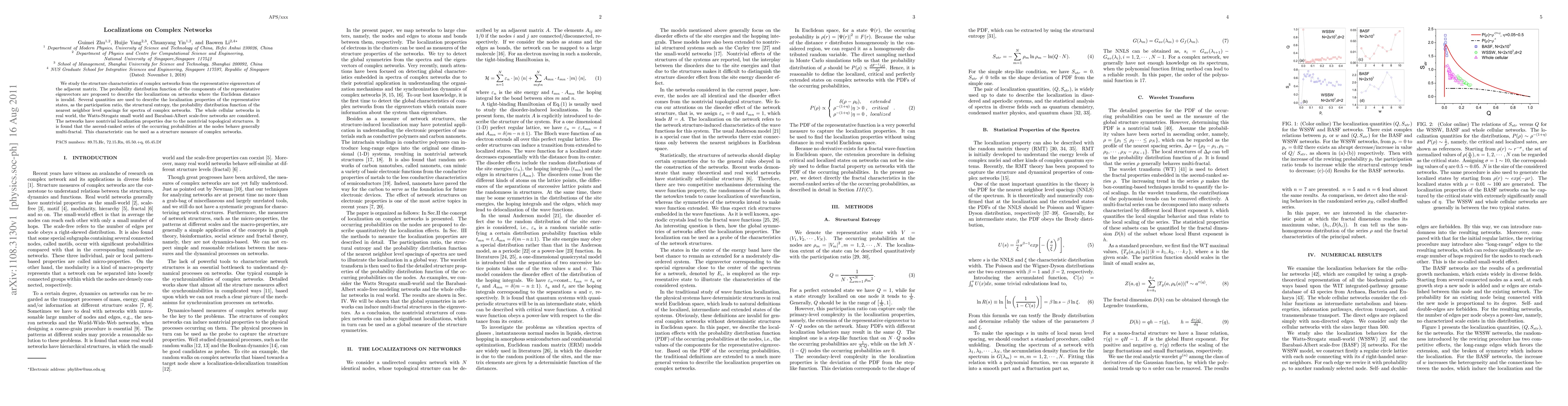 We study the structural characteristics of complex networks using the representative eigenvectors of the adjacent matrix. The probability distribution function of the components of the representative eigenvectors are proposed to describe the localization on networks where the Euclidean distance is invalid. Several quantities are used to describe the localization properties of the representative states, such as the participation ratio, the structural entropy, and the probability distribution function of the nearest neighbor level spacings for spectra of complex networks. Whole-cell networks in the real world and the Watts-Strogatz small-world and Barabasi-Albert scale-free networks are considered. The networks have nontrivial localization properties due to the nontrivial topological structures. It is found that the ascending-order-ranked series of the occurrence probabilities at the nodes behave generally multifractally. This characteristic can be used as a structural measure of complex networks.