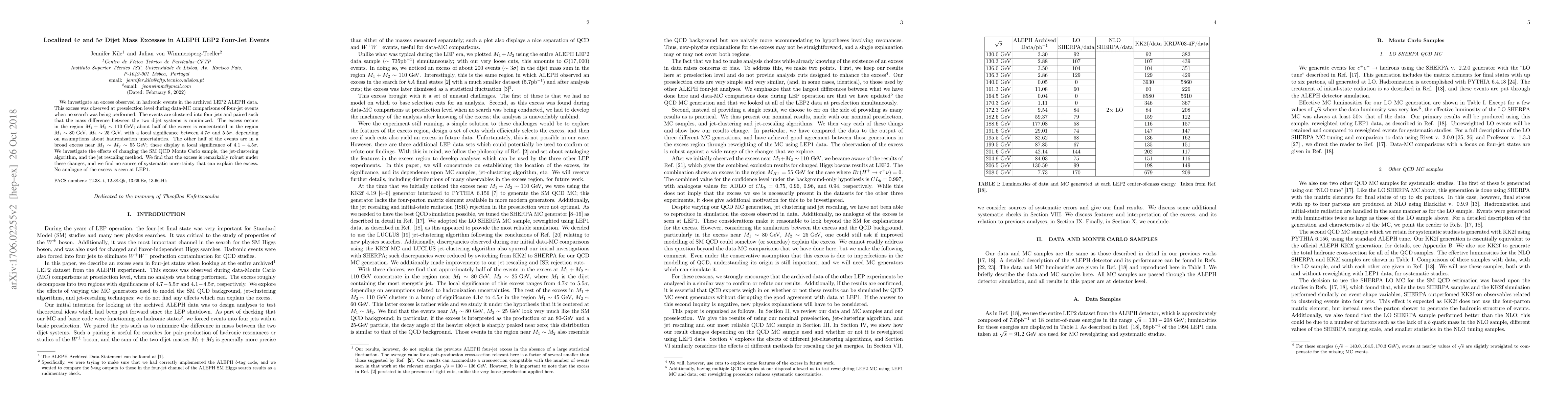 We investigate an excess observed in hadronic events in the archived LEP2 ALEPH data. This excess was observed at preselection level during data-MC comparisons of four-jet events when no search was being performed. The events are clustered into four jets and paired such that the mass difference between the two dijet systems is minimized. The excess occurs in the region $M_1+M_2\sim 110\mbox{ GeV}$; about half of the excess is concentrated in the region $M_1\sim 80\mbox{ GeV}$, $M_2\sim 25\mbox{ GeV}$, with a local significance between $4.7\sigma$ and $5.5\sigma$, depending on assumptions about hadronization uncertainties. The other half of the events are in a broad excess near $M_1\sim M_2\sim 55\mbox{ GeV}$; these display a local significance of $4.1-4.5\sigma$. We investigate the effects of changing the SM QCD Monte Carlo sample, the jet-clustering algorithm, and the jet rescaling method. We find that the excess is remarkably robust under these changes, and we find no source of systematic uncertainty that can explain the excess. No analogue of the excess is seen at LEP1.
