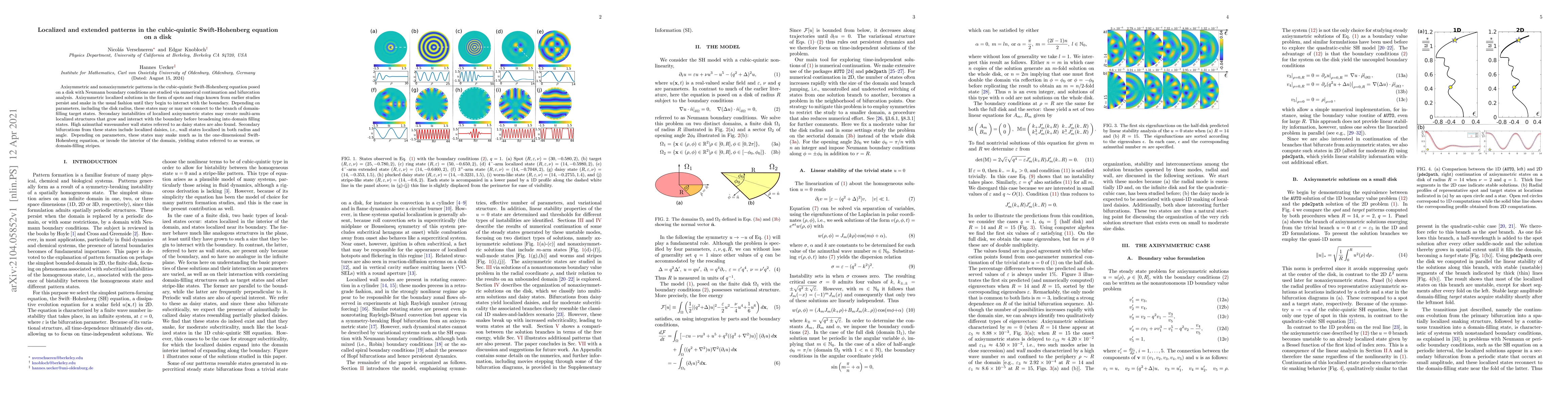 Axisymmetric and nonaxisymmetric patterns in the cubic-quintic Swift-Hohenberg equation posed on a disk with Neumann boundary conditions are studied via numerical continuation and bifurcation analysis. Axisymmetric localized solutions in the form of spots and rings known from earlier studies persist and snake in the usual fashion until they begin to interact with the boundary. Depending on parameters, including the disk radius, these states may or may not connect to the branch of domain-filling target states. Secondary instabilities of localized axisymmetric states may create multi-arm localized structures that grow and interact with the boundary before broadening into domain filling states. High azimuthal wavenumber wall states referred to as daisy states are also found. Secondary bifurcations from these states include localized daisies, i.e., wall states localized in both radius and angle. Depending on parameters, these states may snake much as in the one-dimensional Swift-Hohenberg equation, or invade the interior of the domain, yielding states referred to as worms, or domain-filling stripes.