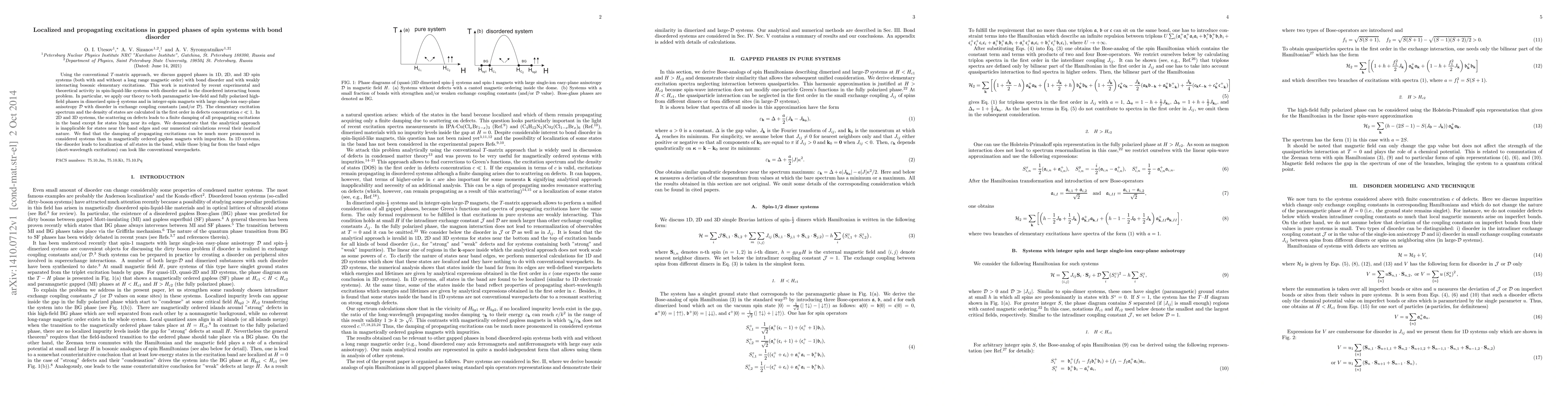 This paper uses the $T$-matrix approach to study gapped spin systems with bond disorder, focusing on 1D, 2D, and 3D systems. It finds that disorder significantly impacts excitations, leading to localization in 1D systems and finite damping in higher dimensions, especially near band edges.