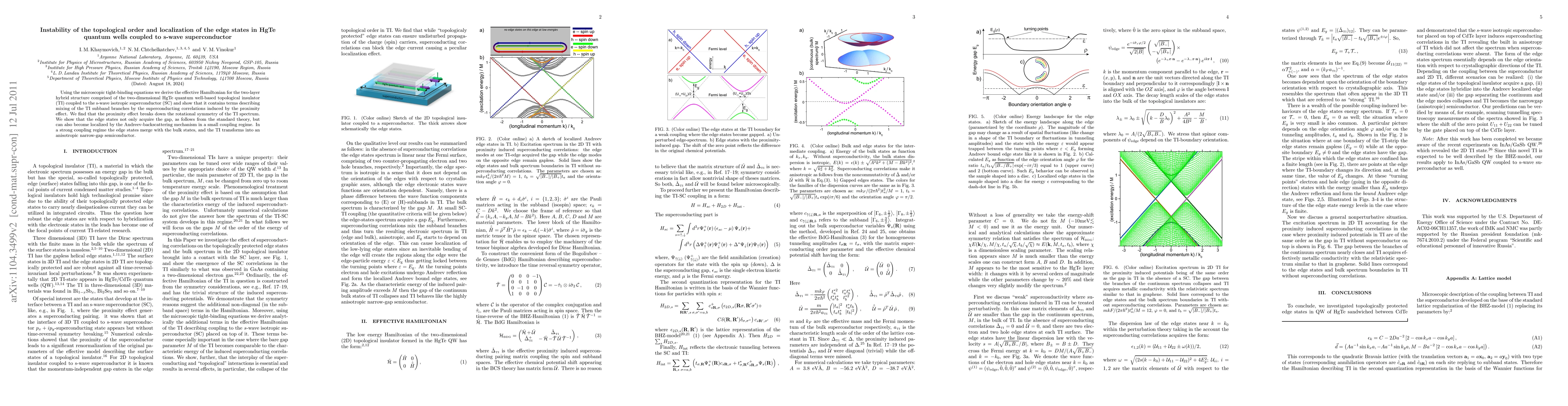 We investigate the interplay of superconductivity and the topological order in the topological insulator (TI) formed in HgTe-CdTe quantum wells coupled to the s-wave isotropic superconductor (SC) placed on top of CdTe layer. Proximity effect induces superconducting correlations in TI effecting classification of the TI electronic states. Depending on the strength of the coupling and the initial chemical potentials in SC and TI, the edge states either (i) become gapped, or (ii) hybridize into localized Andreev states, or else (iii) merge with the bulk states turning the TI into an anisotropic narrow-gap semiconductor.