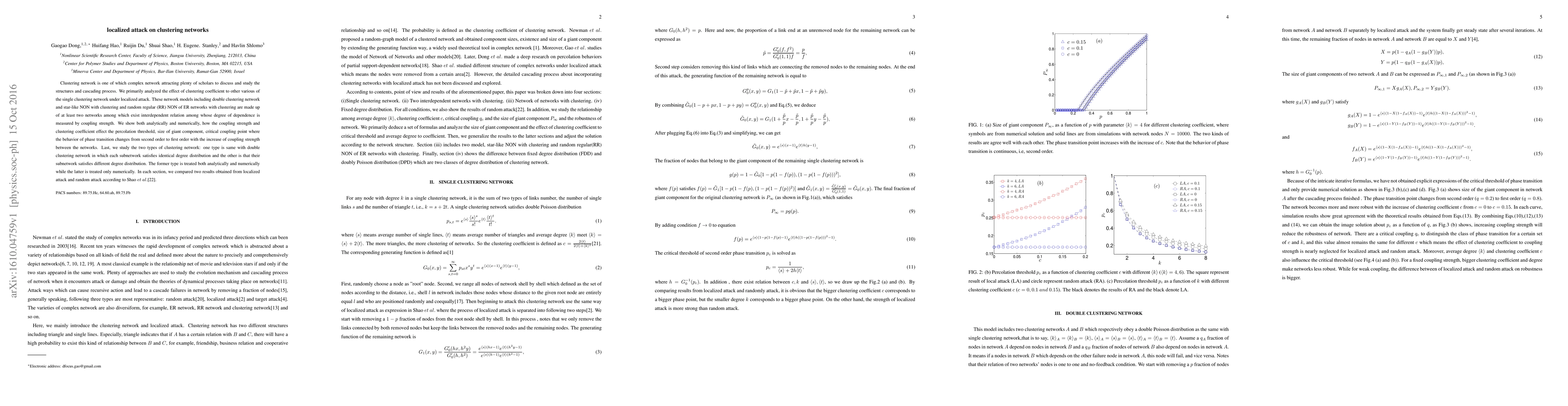 This paper investigates localized attacks on clustering networks, analyzing how clustering coefficient and coupling strength influence percolation thresholds, giant component sizes, and phase transition behaviors. Both analytical and numerical methods are employed to compare outcomes from localized versus random attacks on various network models, including double clustering and star-like networks.