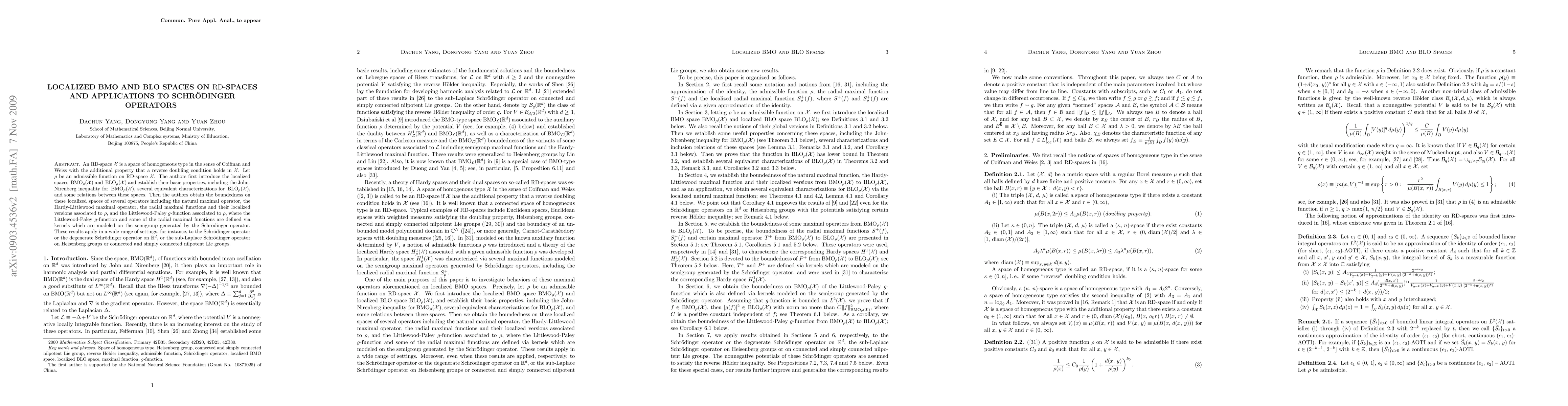 This paper introduces localized BMO and BLO spaces on RD-spaces and establishes their properties, including inequalities and characterizations. The authors demonstrate boundedness of various operators on these spaces, with applications to Schrödinger operators in diverse settings like Euclidean spaces and Heisenberg groups.