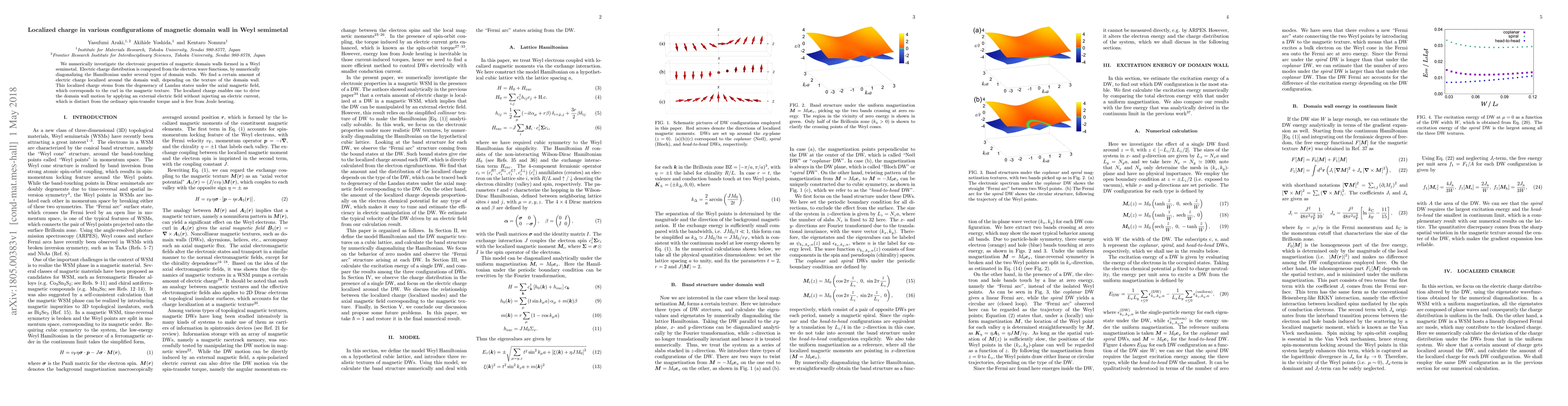 We numerically investigate the electronic properties of magnetic domain walls formed in a Weyl semimetal. Electric charge distribution is computed from the electron wave functions, by numerically diagonalizing the Hamiltonian under several types of domain walls. We find a certain amount of electric charge localized around the domain wall, depending on the texture of the domain wall. This localized charge stems from the degeneracy of Landau states under the axial magnetic field, which corresponds to the curl in the magnetic texture. The localized charge enables one to drive the domain wall motion by applying an external electric field without injecting an electric current, which is distinct from the ordinary spin-transfer torque and is free from Joule heating.