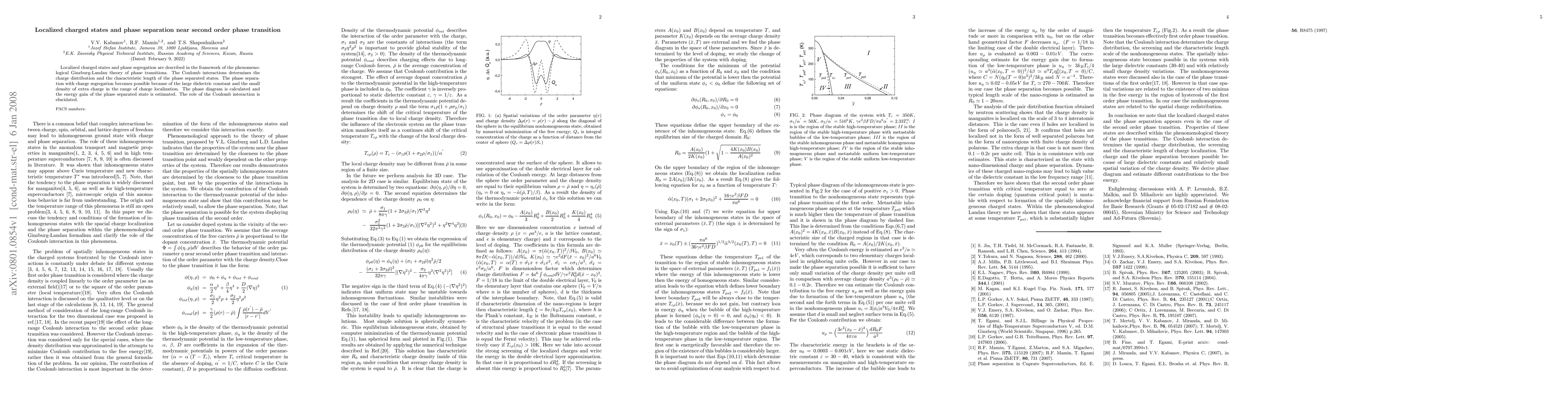 Localized charged states and phase segregation are described in the framework of the phenomenological Ginzburg-Landau theory of phase transitions. The Coulomb interactions determines the charge distribution and the characteristic length of the phase separated states. The phase separation with charge segregation becomes possible because of the large dielectric constant and the small density of extra charge in the range of charge localization. The phase diagram is calculated and the energy gain of the phase separated state is estimated. The role of the Coulomb interaction is elucidated.