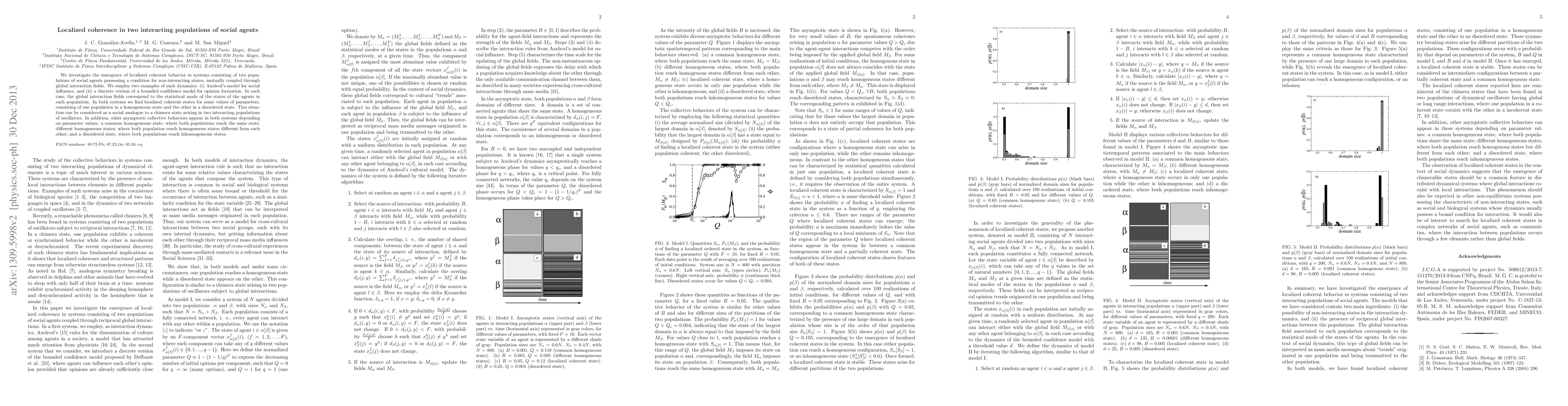 This paper explores localized coherent behavior in two interacting populations of social agents, finding localized coherent states where one population remains homogeneous while the other is disordered, akin to chimera states. It also identifies other collective behaviors depending on parameter values, including common homogeneous states and different homogeneous states.