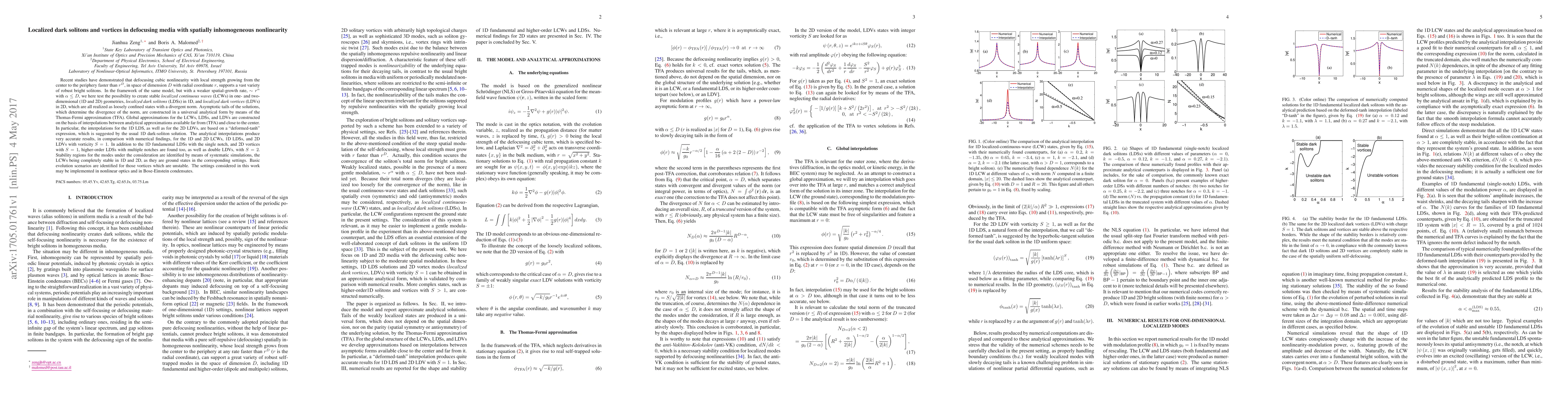 This paper explores the creation of stable localized dark solitons (LDSs) and vortices (LDVs) in defocusing media with spatially inhomogeneous nonlinearity, demonstrating the existence of fundamental and higher-order localized continuous waves, LDSs, and LDVs using analytical and global approximations. Stability regions and basic evolution scenarios for unstable vortices are identified through simulations.