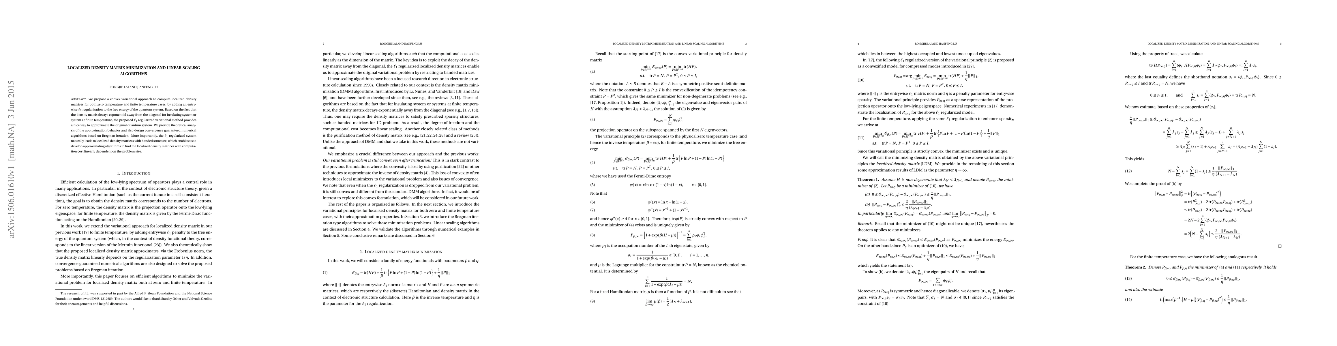 This paper proposes a convex variational method with $\ell_1$ regularization to compute localized density matrices for quantum systems, both at zero and finite temperatures. The method leverages the exponential decay of density matrices to achieve linear scaling in computational cost, enabling efficient approximation of the original quantum system.